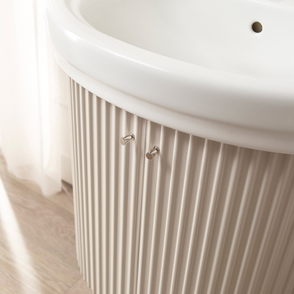 Szafka łazienkowa z MDF z dwojgiem drzwi z wykończeniem cannetté , matowym wykończeniem, jedną półką z MDF Idro, w komplecie z ceramicznym zlewem i niklowymi gałkami w zestawie z matowymi białymi nogami MDF .