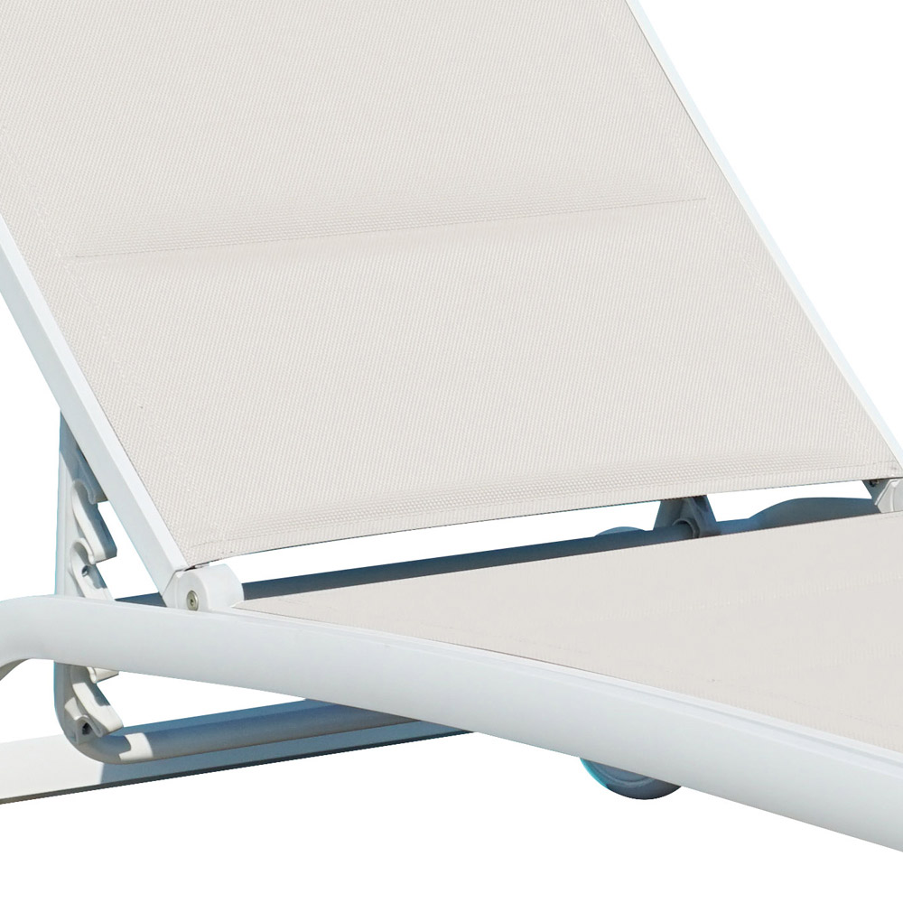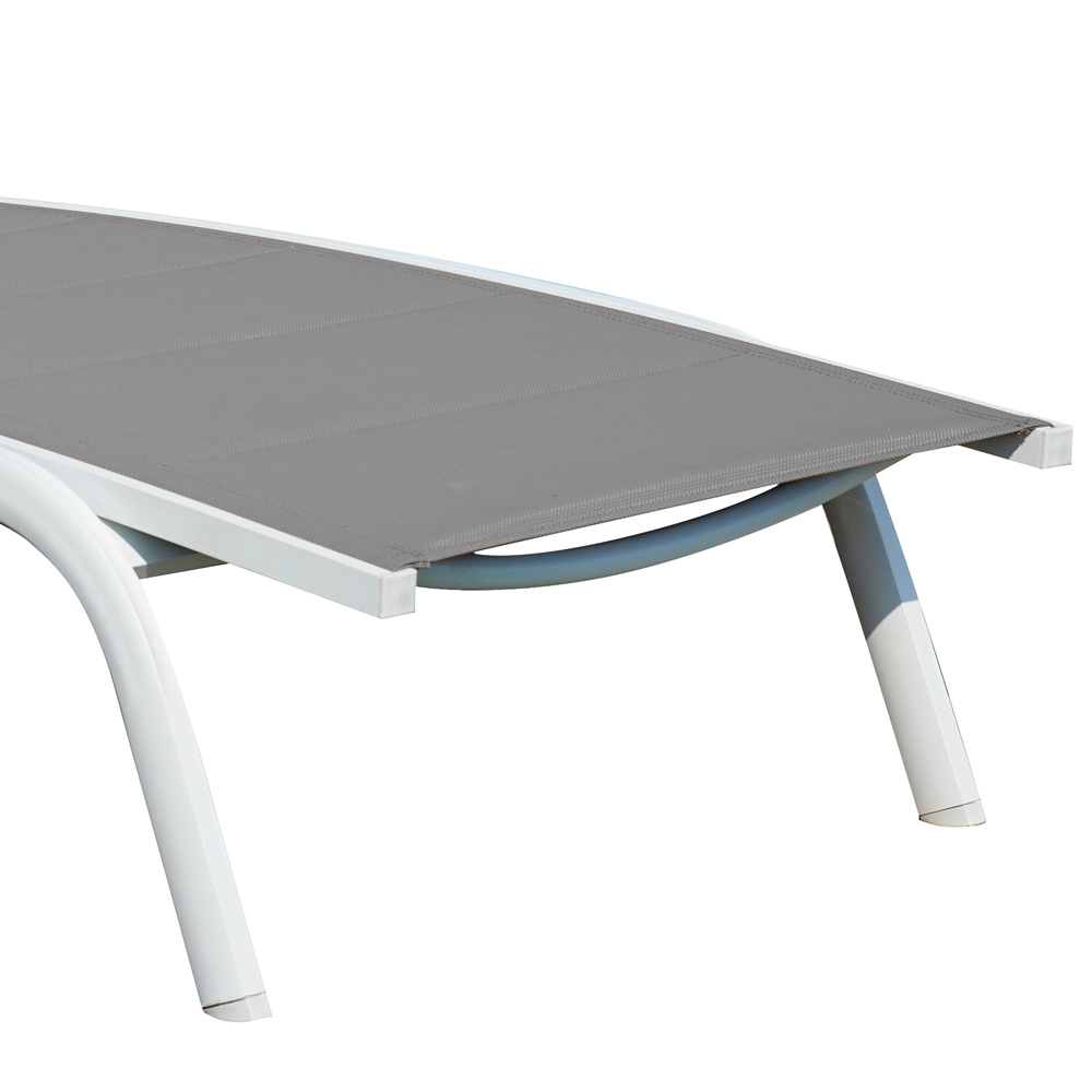 Szezlong z możliwością układania w stosy z siedziskiem z tkaniny tekstylnej i aluminiową konstrukcją.