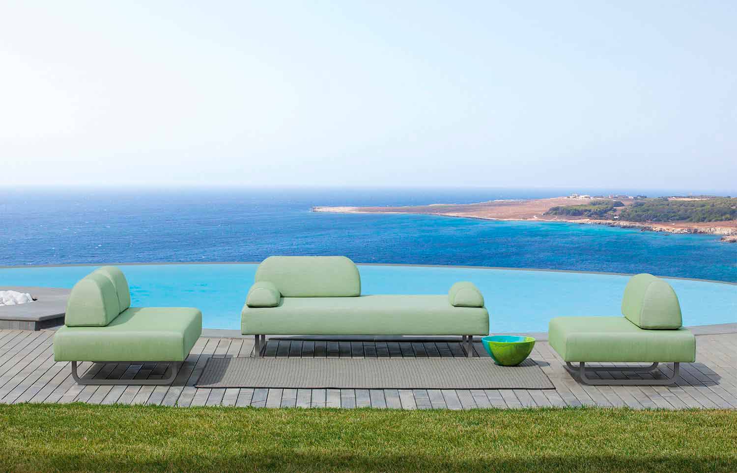 Designerska leżanka ogrodowa wykonana z ocynkowanego żelaza malowanego proszkowo i tkaniny akrylowej w 100% barwionej. Wyprodukowano we Włoszech.
