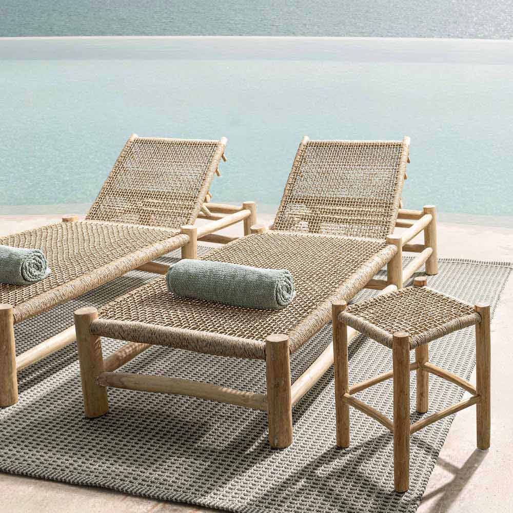 Odchylany szezlong zewnętrzny z drewna tekowego i włókna syntetycznego.