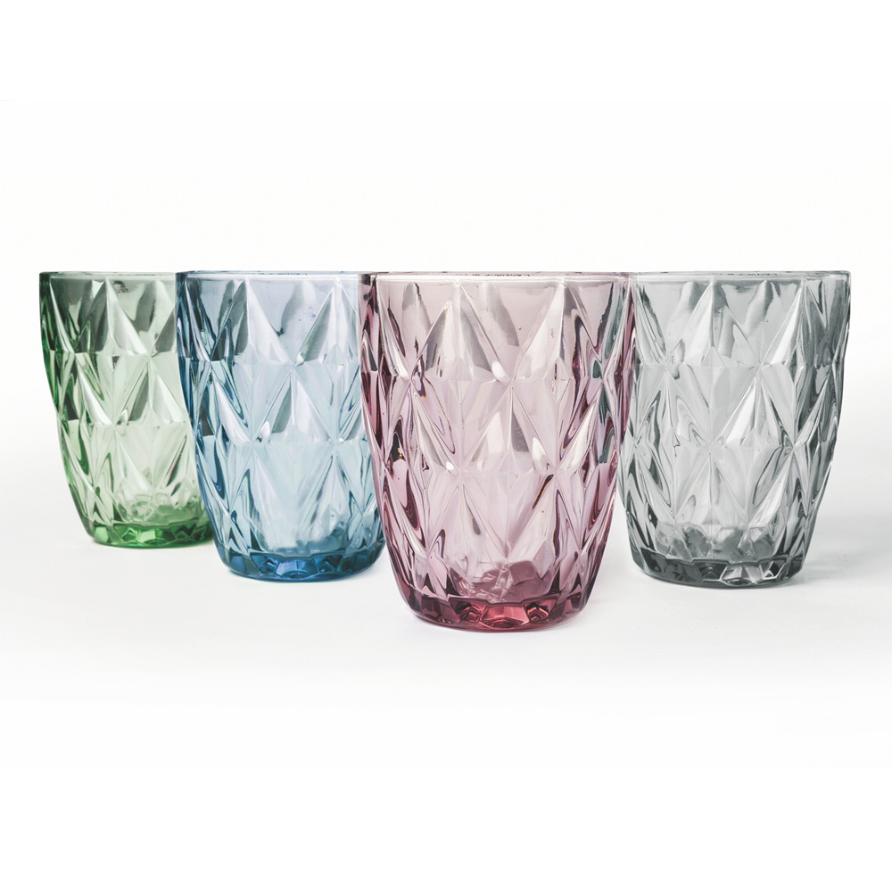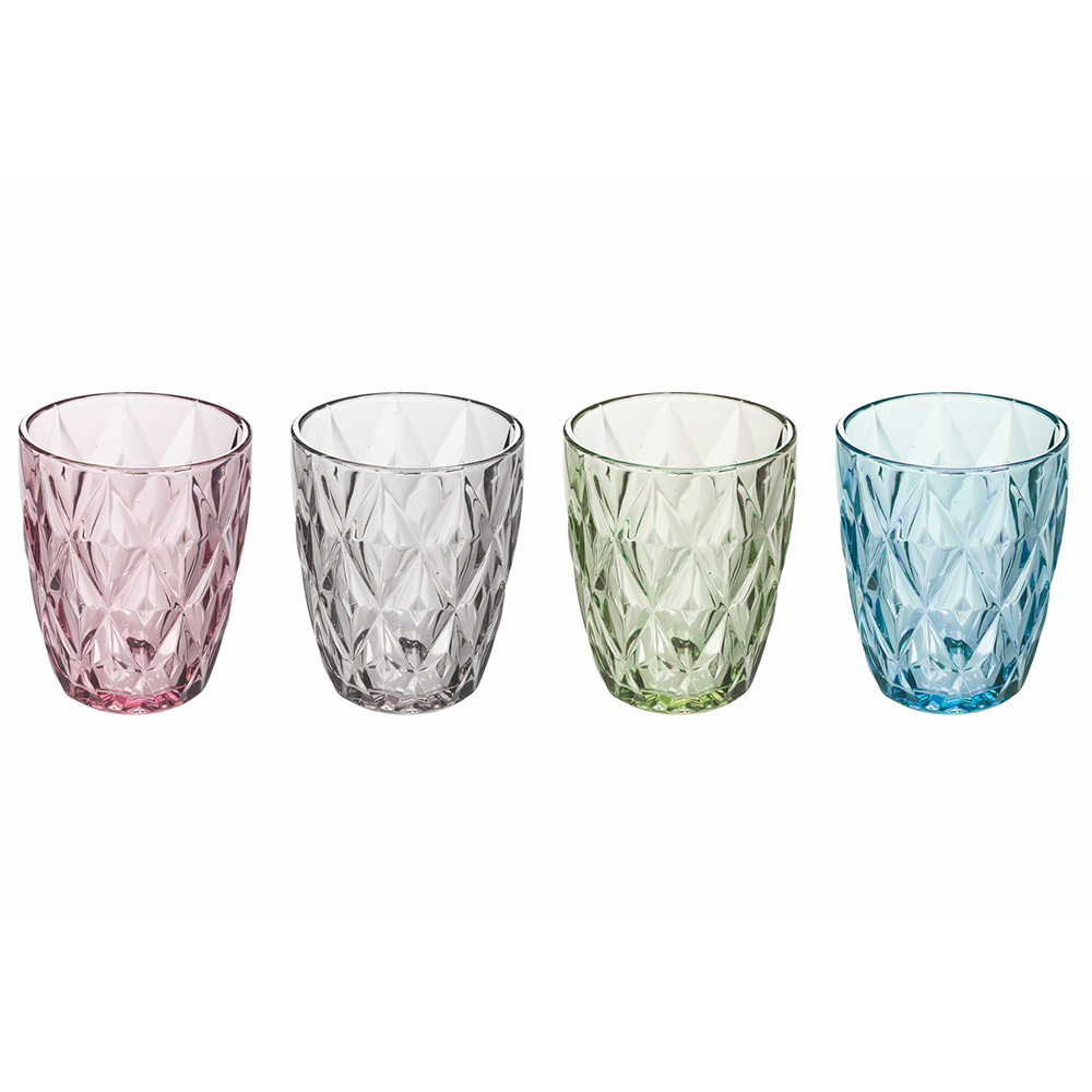Zestaw kolorowych szklanych szklanek do wody z rzeźbieniami, 12 sztuk.