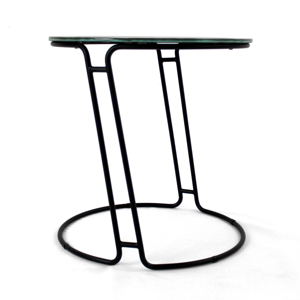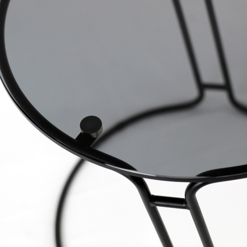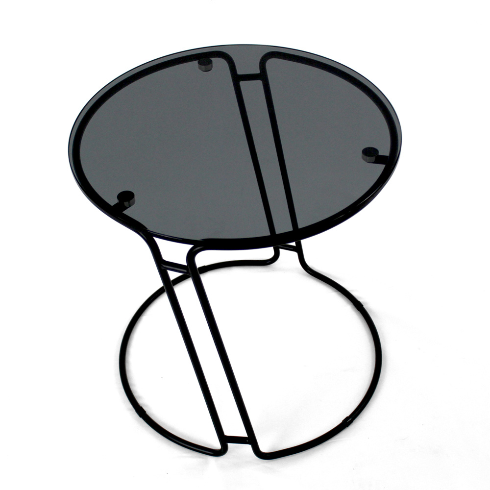 Okrągły stolik kawowy z malowaną stalową podstawą i szklany blat.