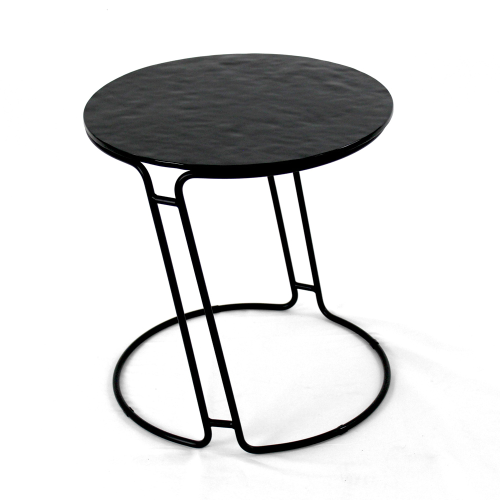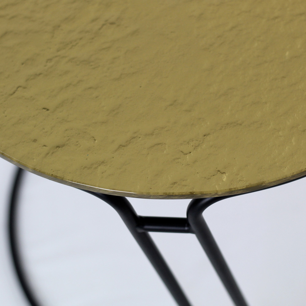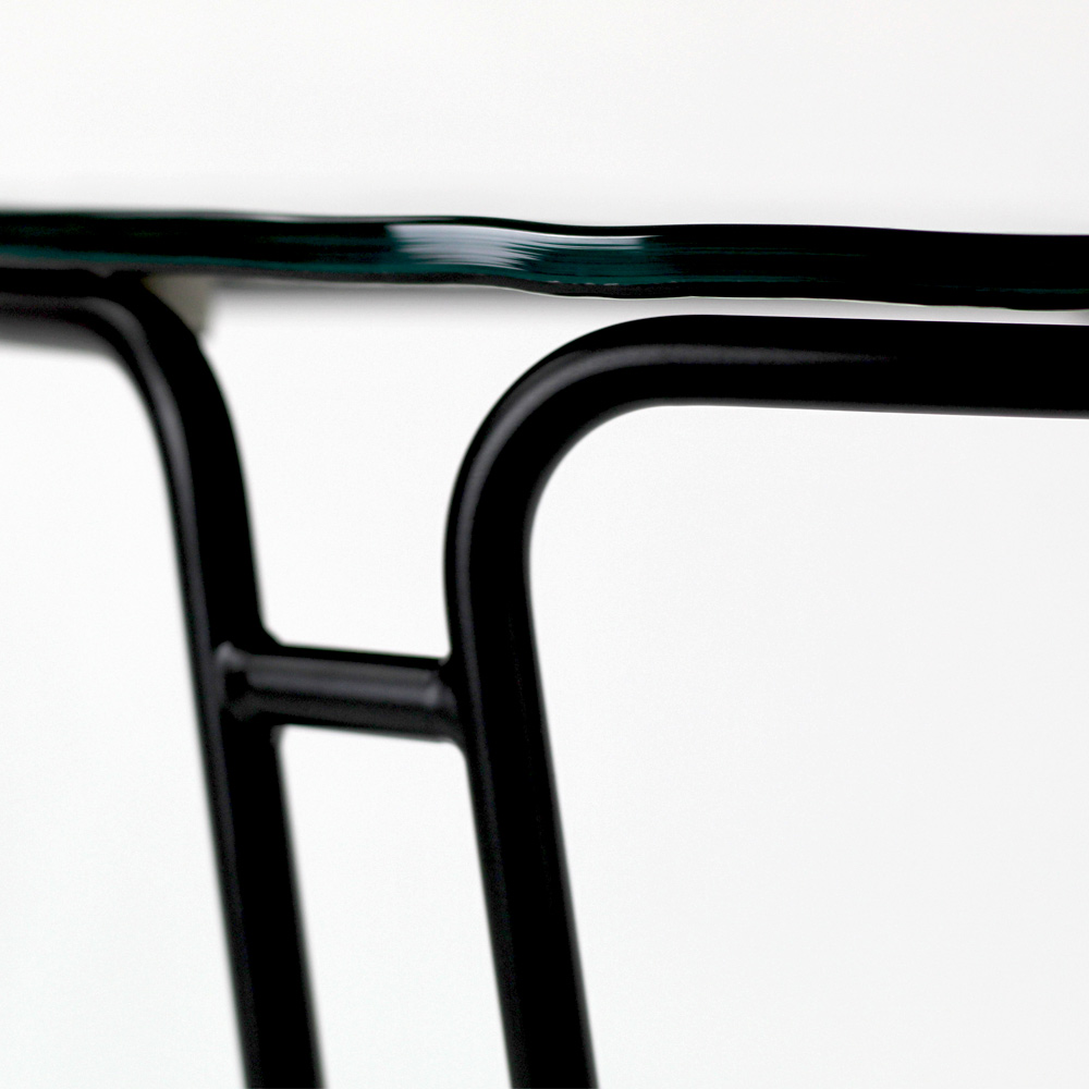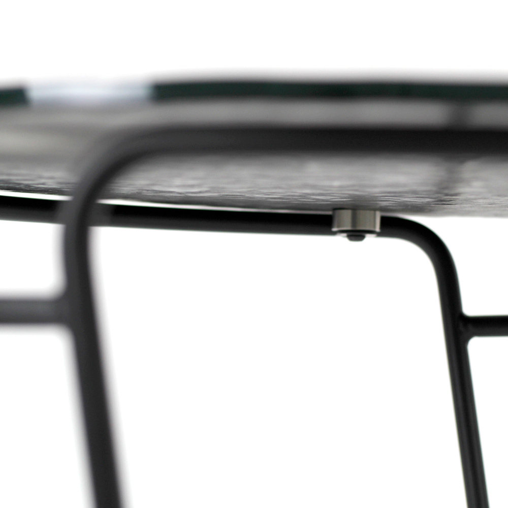 Okrągły stolik kawowy z malowaną stalową podstawą i szklany blat.