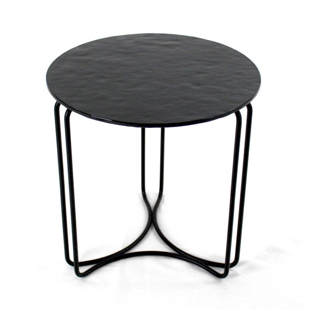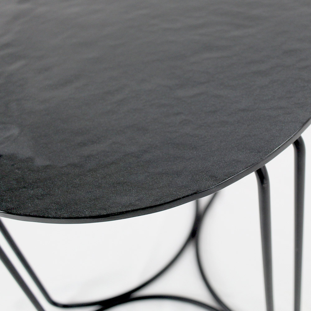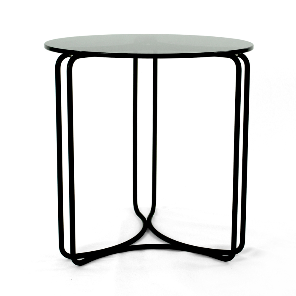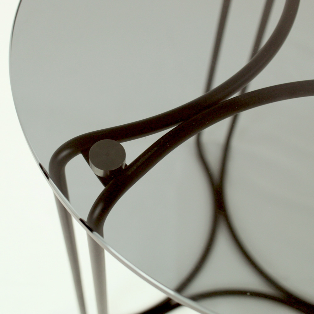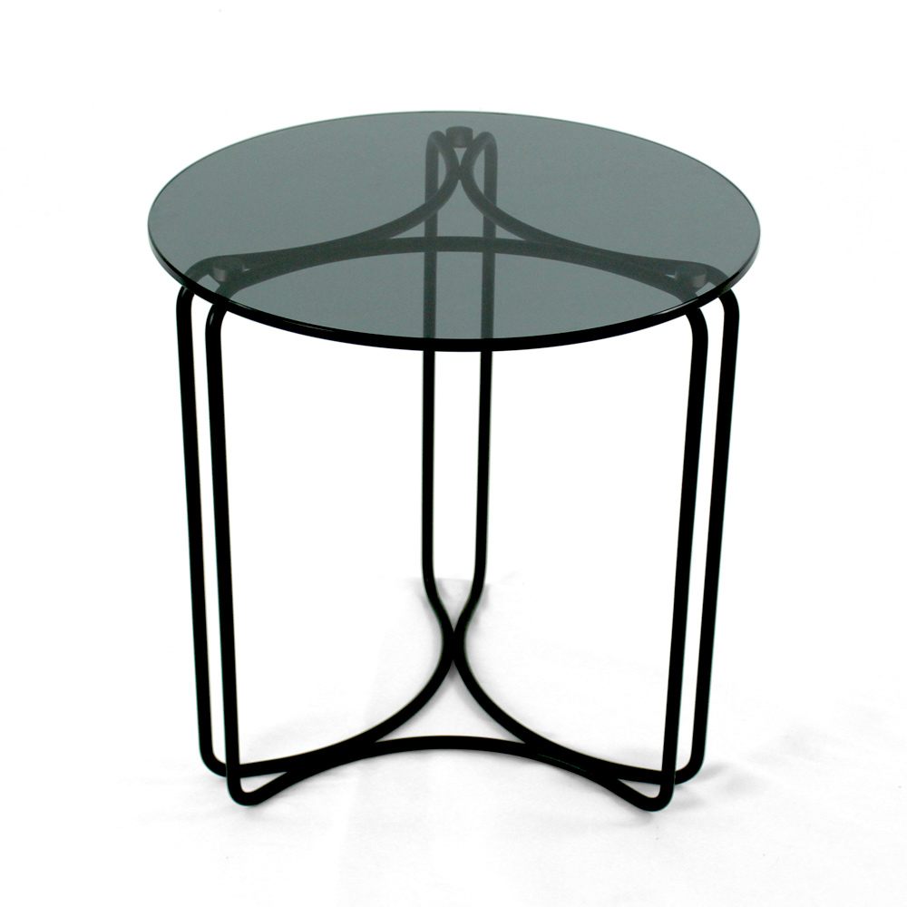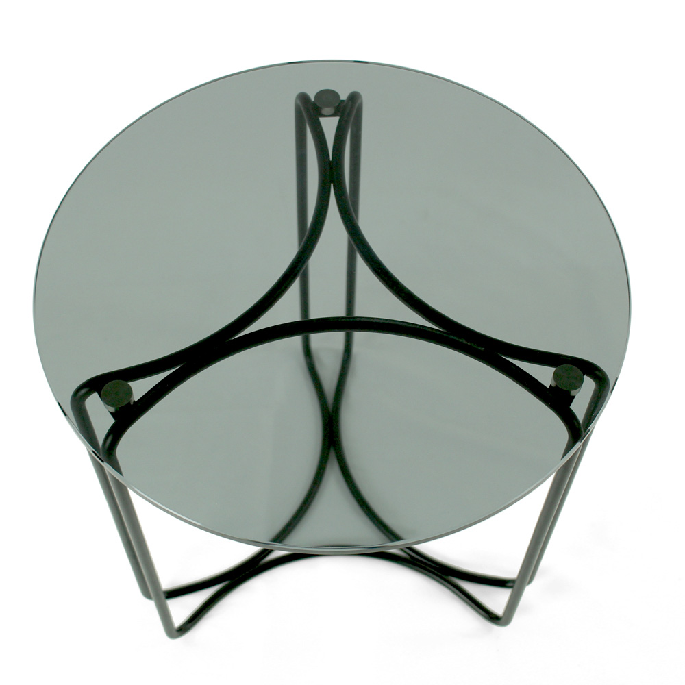 Okrągły stolik kawowy z malowaną stalową podstawą i szklany blat.