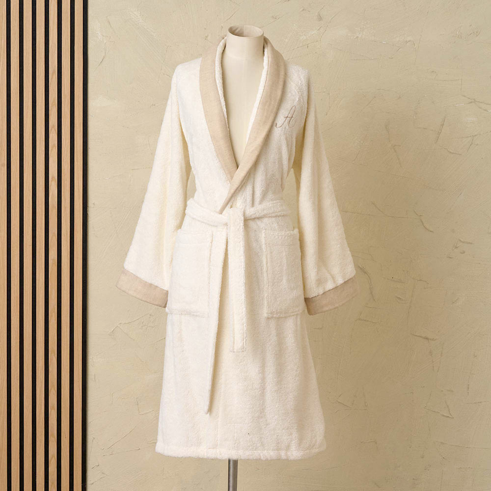 Szlafrok z szalowym kołnierzem, wykonany z miękkiej czystej bawełny frotte, z falbaną z czystego lnu i monogramem wyszytym na piersi przez włoskich hafciarzy.