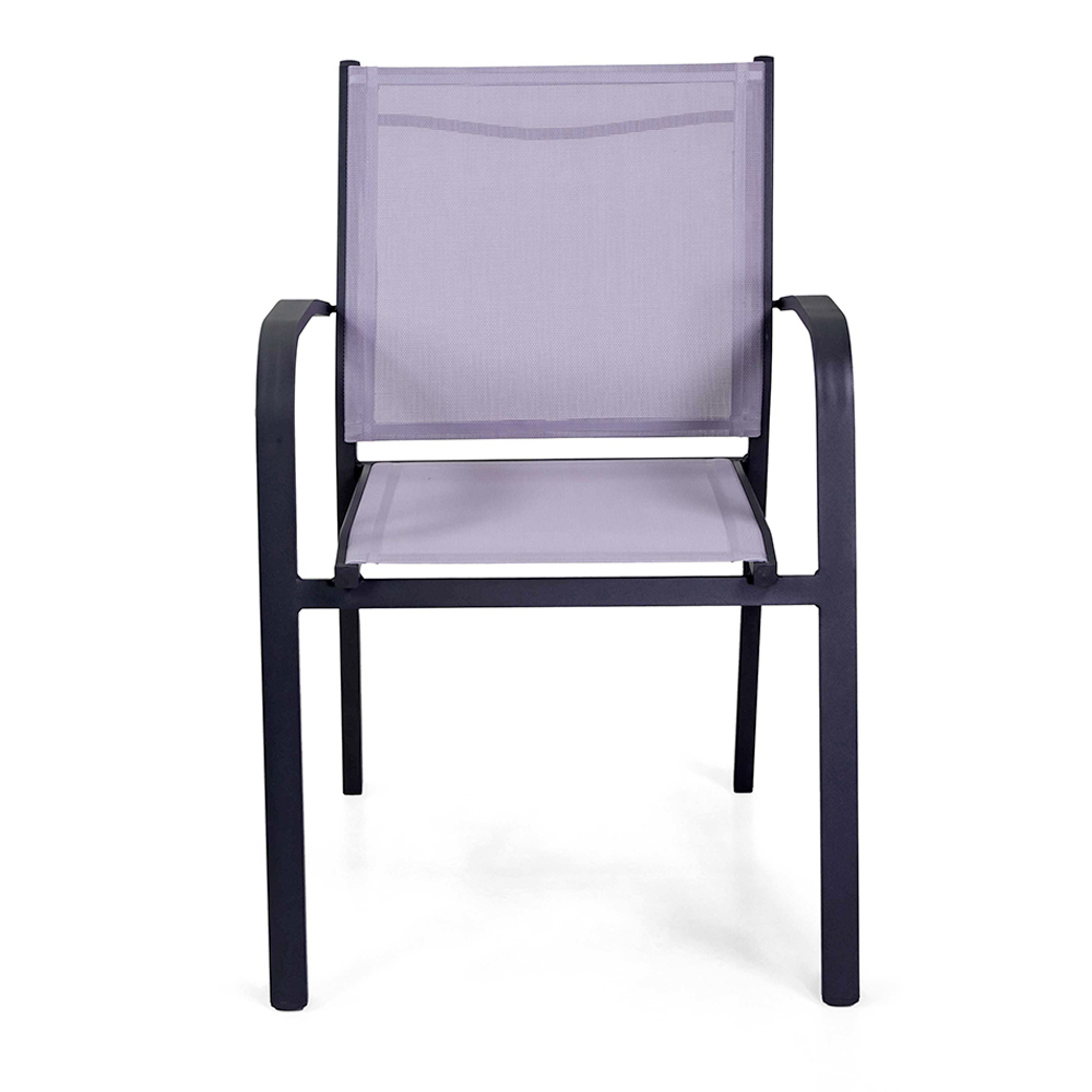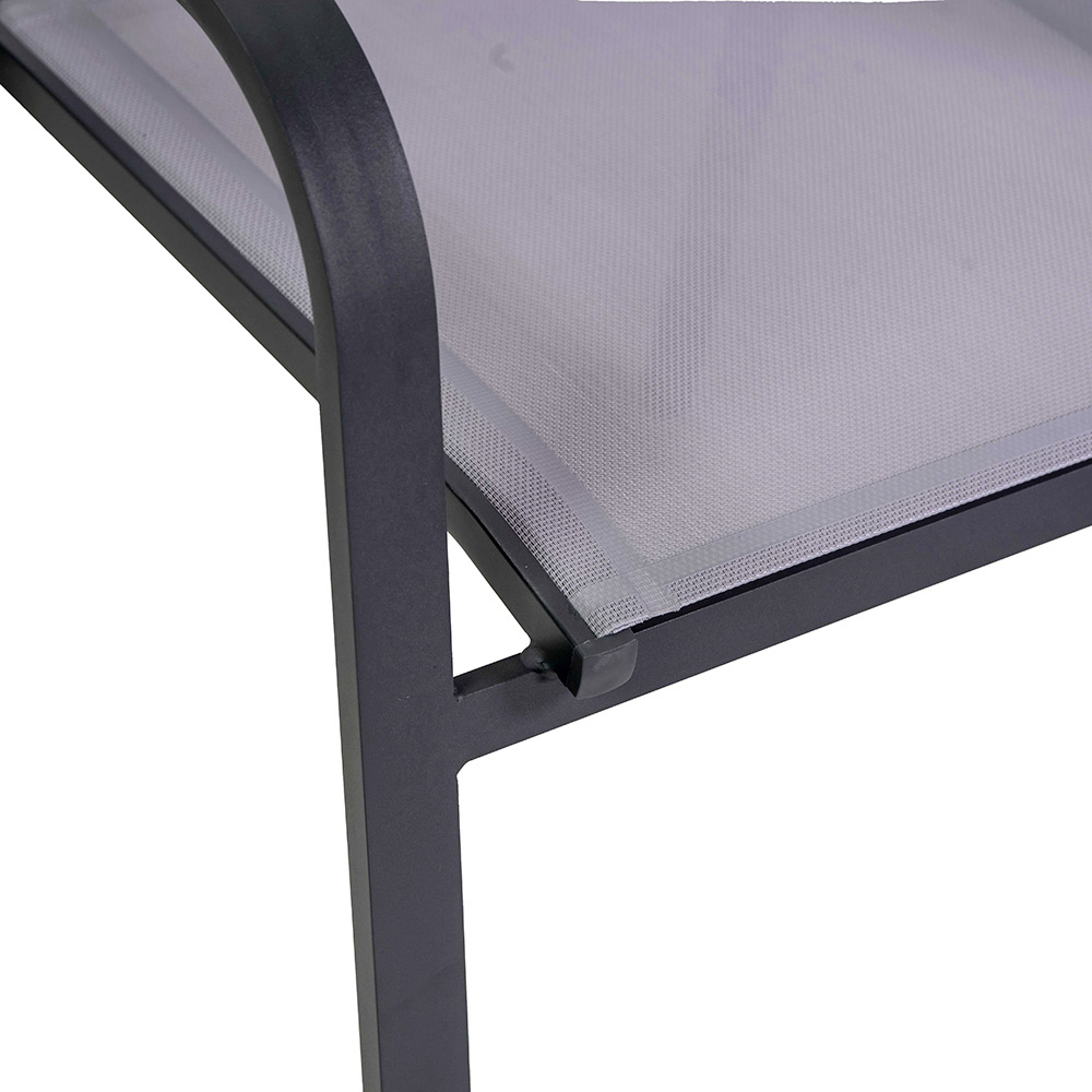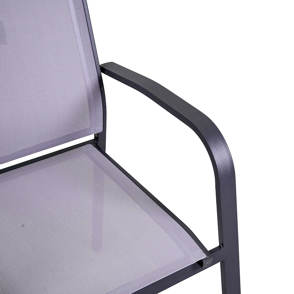 To krzesło z antracytową ramą aluminiową malowaną proszkowo reprezentuje idealną równowagę między funkcjonalnością i stylem, idealną do środowisk zewnętrznych, takich jak ogrody i tarasy. Szary textilene nie tylko nadaje mu nowoczesny i elegancki wygląd, ale także zapewnia wygodne i odporne na warunki atmosferyczne siedzisko.