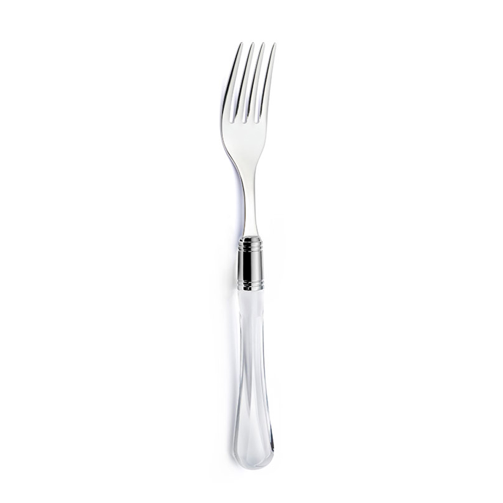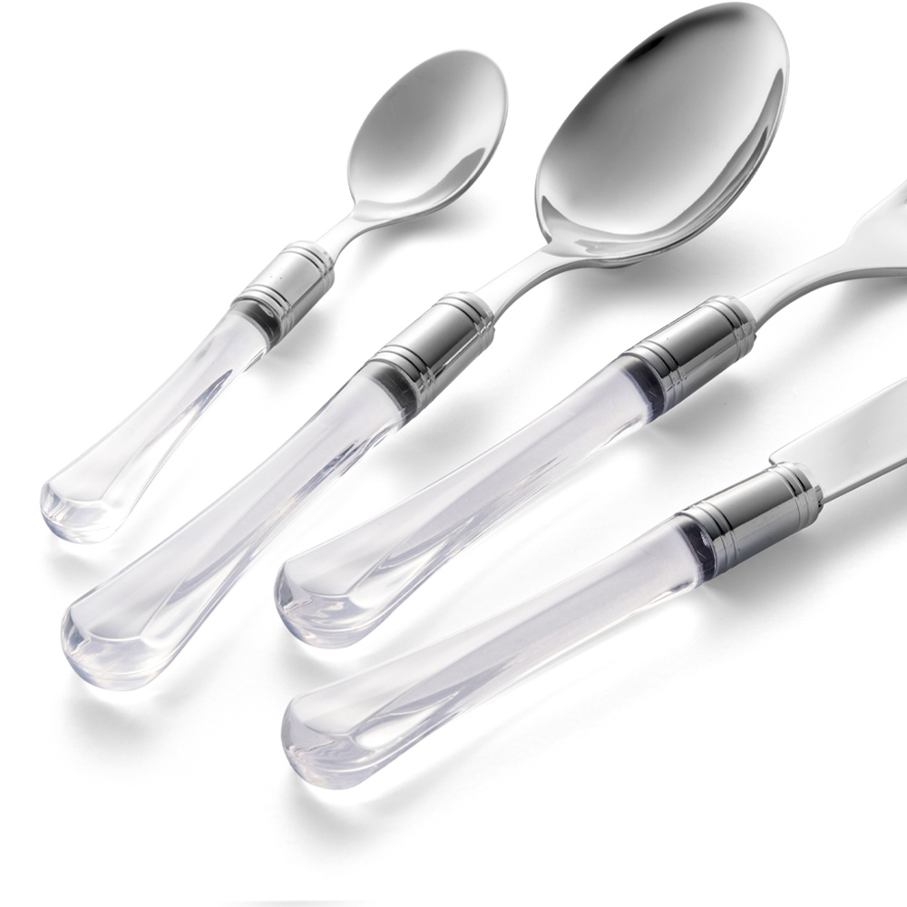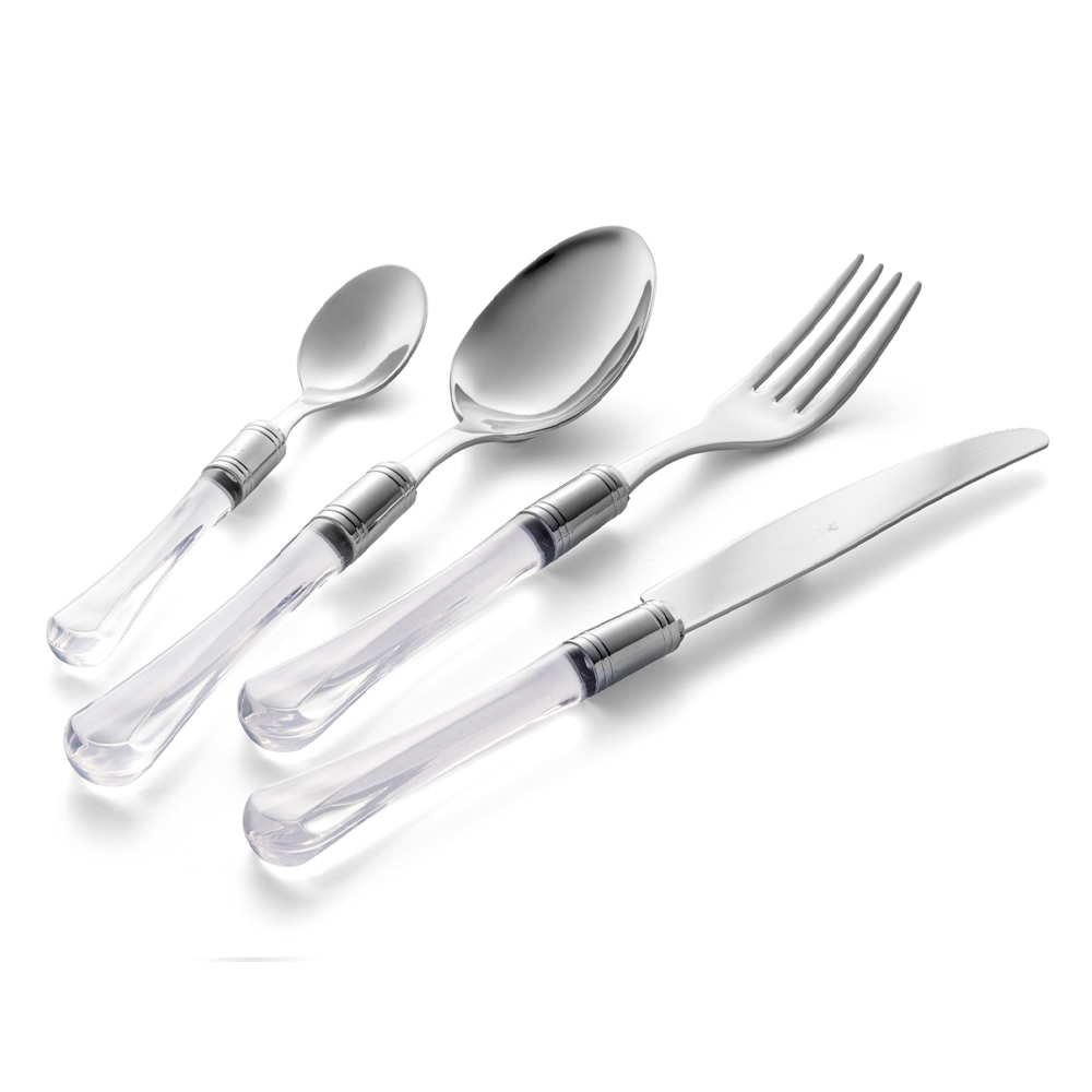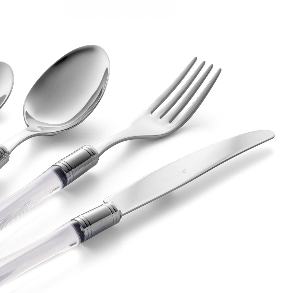 Zestaw sztućców ze stali nierdzewnej i 24-częściowy przezroczysty plastikowy uchwyt wyprodukowany we Włoszech.