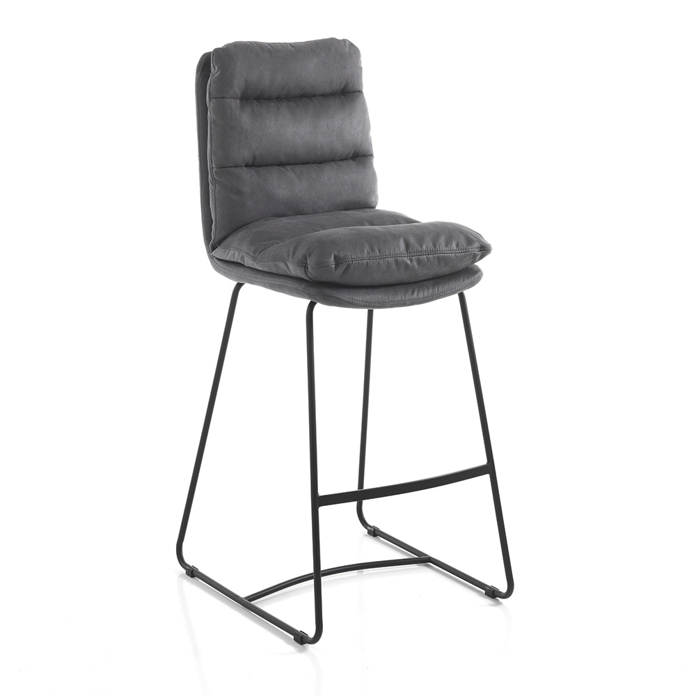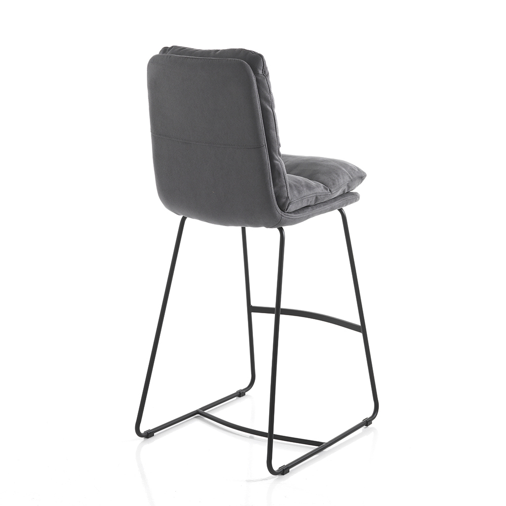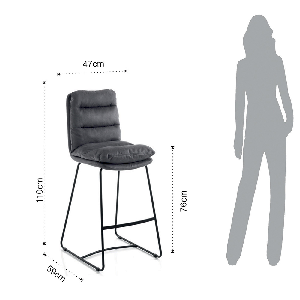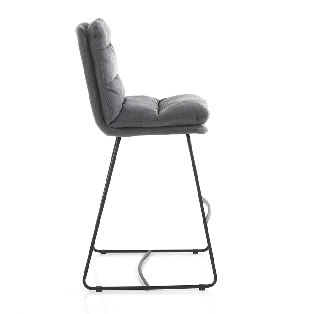 Wysoki stołek kuchenny o konstrukcji ślizgowej wykonany z matowej stali malowanej na czarno w komplecie z praktycznym podnóżkiem i wyściełanym siedziskiem pokrytym miękką mikrofibrą w kolorze szarego aksamitu . Produkt, którego estetykę wyznaczają proste linie i kształty wzbogacone eleganckim pikowaniem, które okrywa całe siedzisko, dając jeszcze więcej wspaniałego odczucia komfortu. Idealny do umieszczenia w jadalni i kuchni, ale także w pomieszczeniach biurowych, takich jak bary i restauracje, dzięki eleganckiemu i wyrafinowanemu wzornictwu oraz wszechstronności zastosowania.