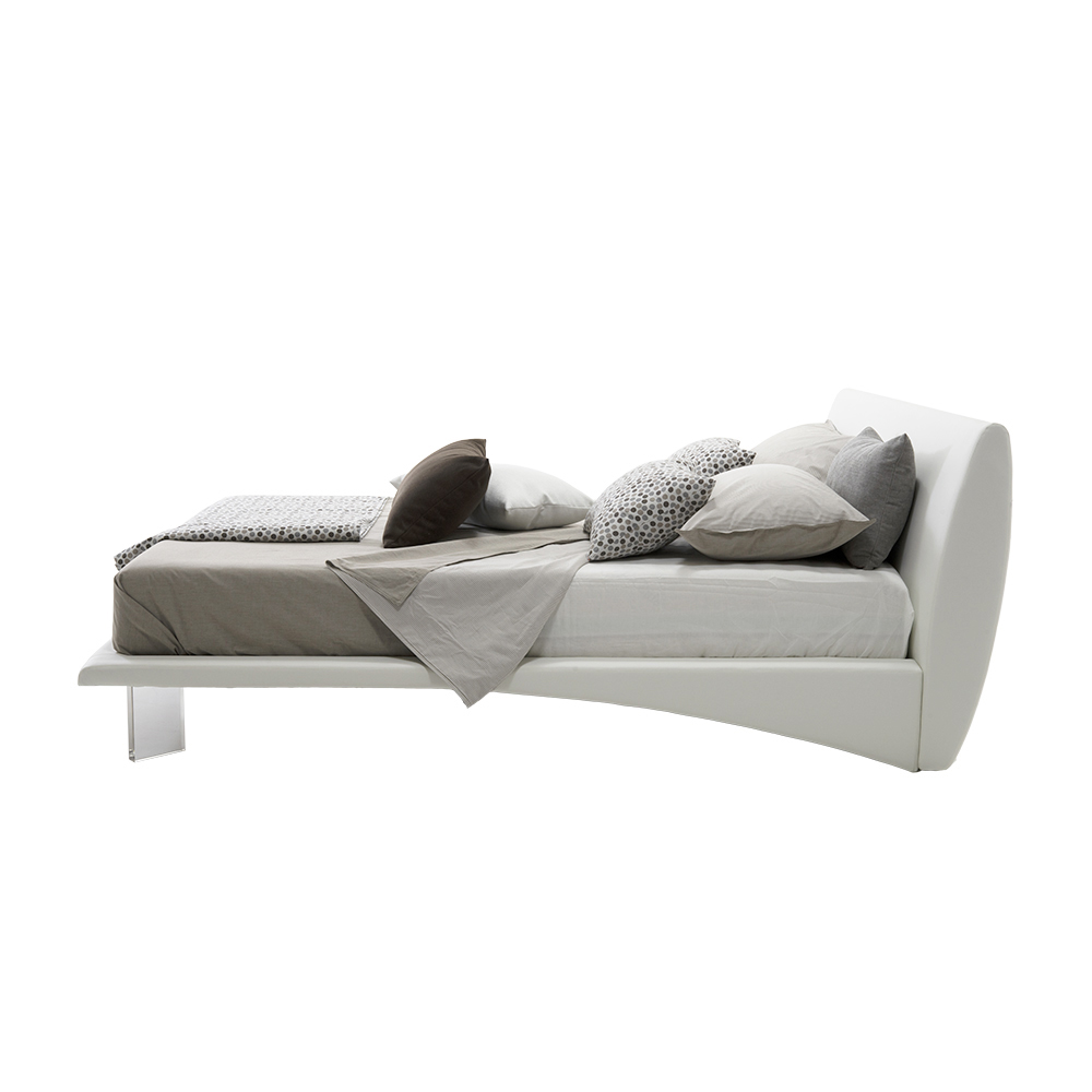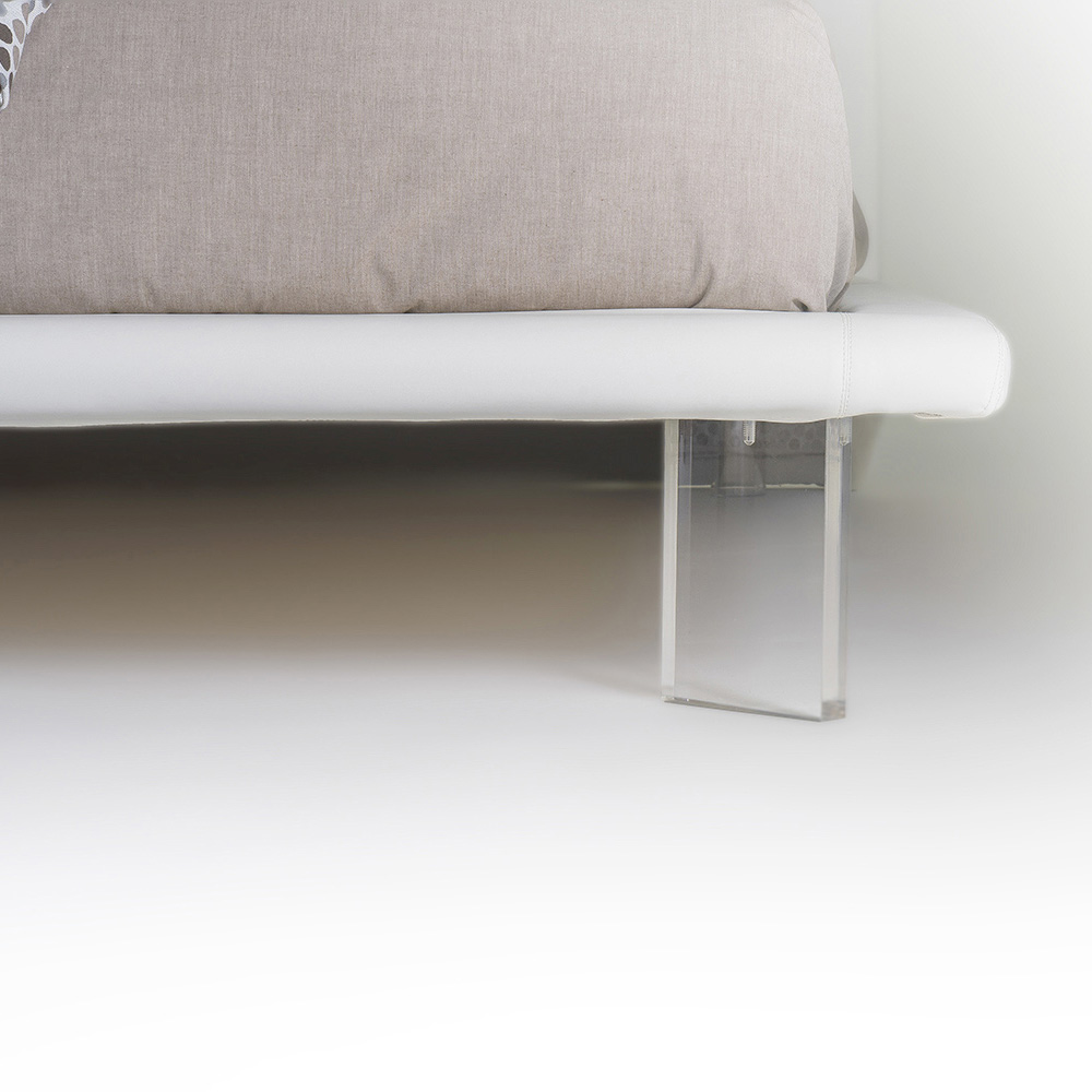 Cechą szczególną są podwójne szwy obwodowe wezgłowia i ramy łóżka oraz nóżki z pleksi, które tworzą efekt zawieszenia.