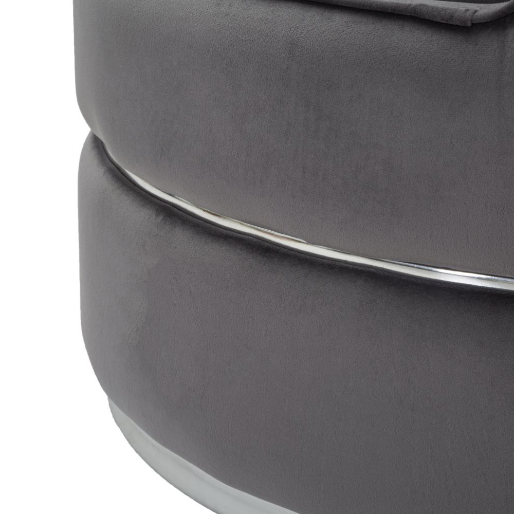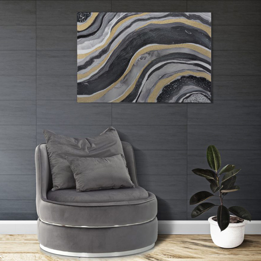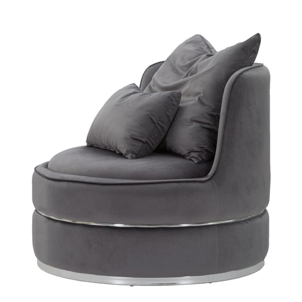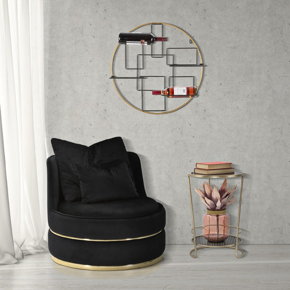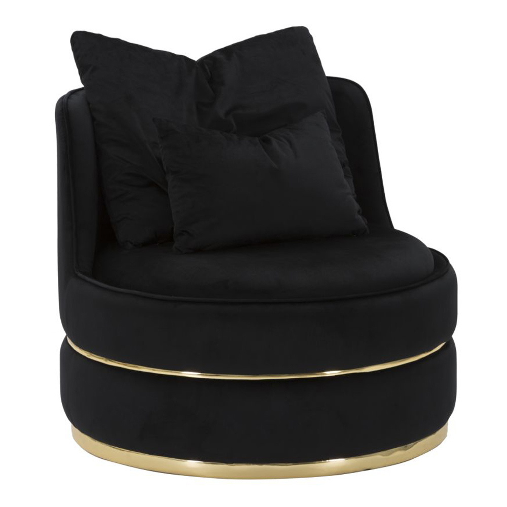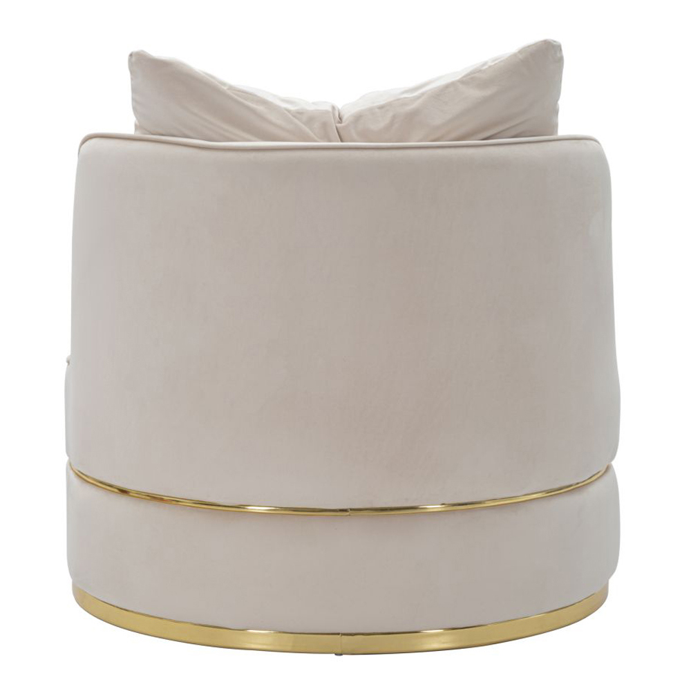 Nowoczesny fotel do salonu w całości pokryty tkaniną ze złotymi lub srebrnymi detalami.
