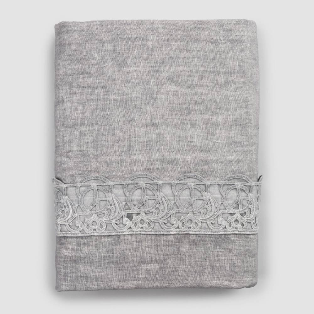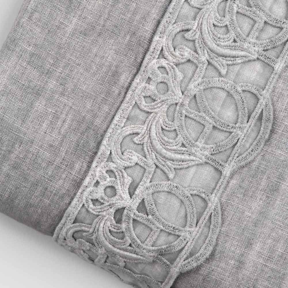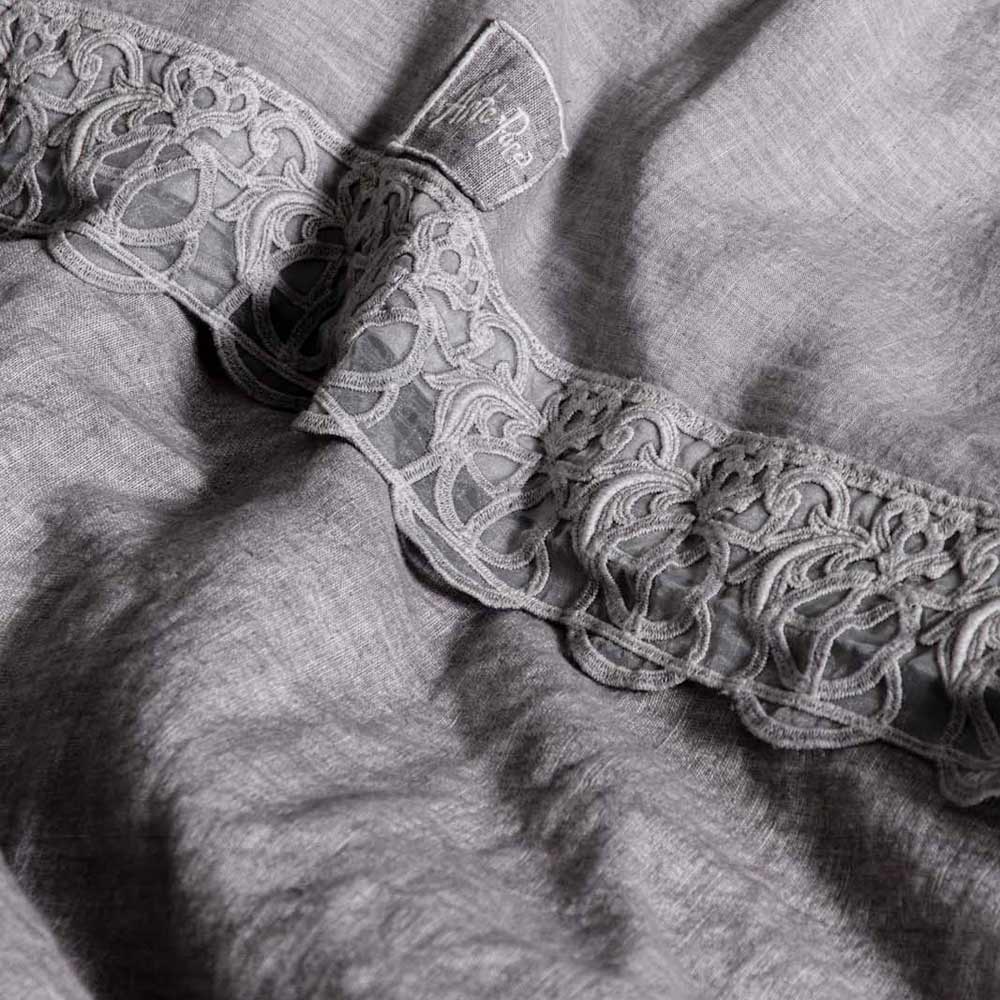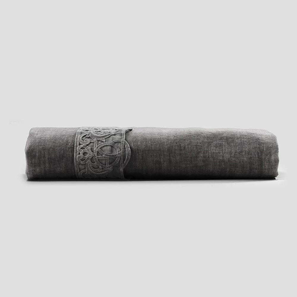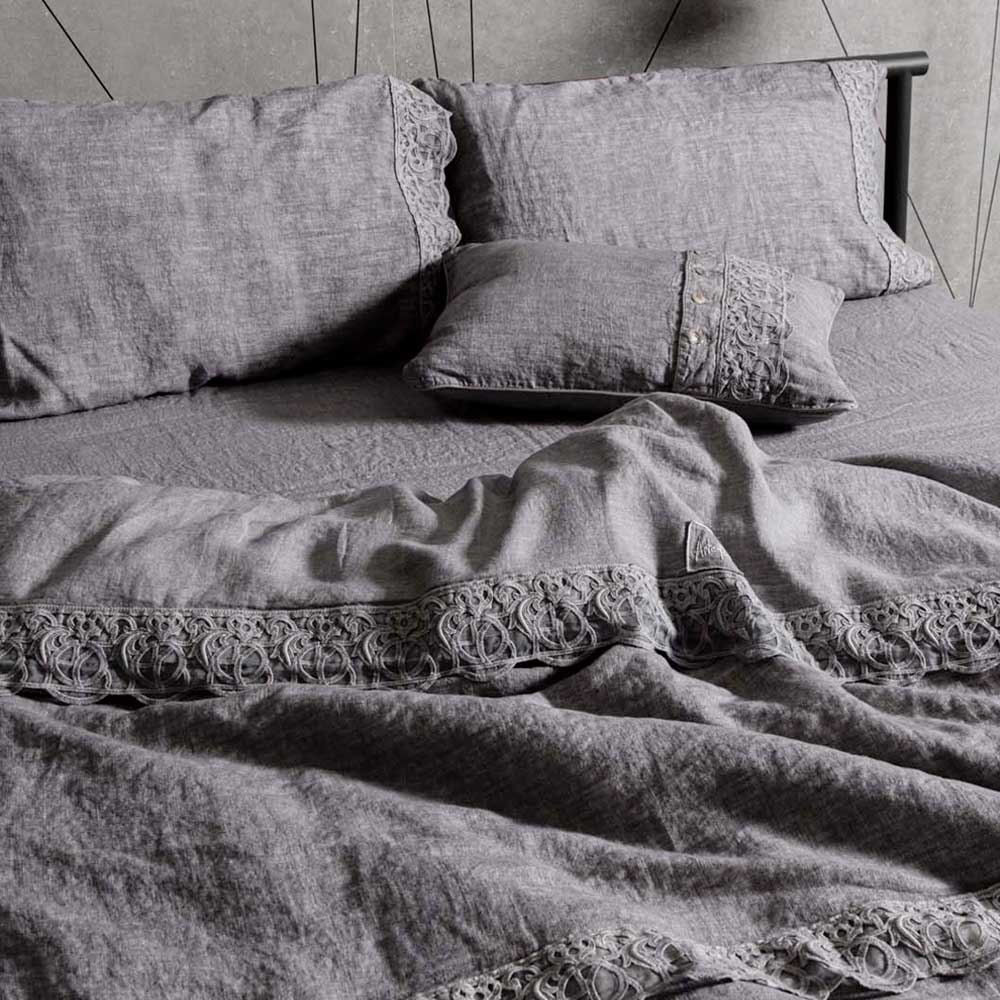 Podwójna poszwa na kołdrę z szarego lnu z koronkowymi kroplami, ręcznie robiona we Włoszech.