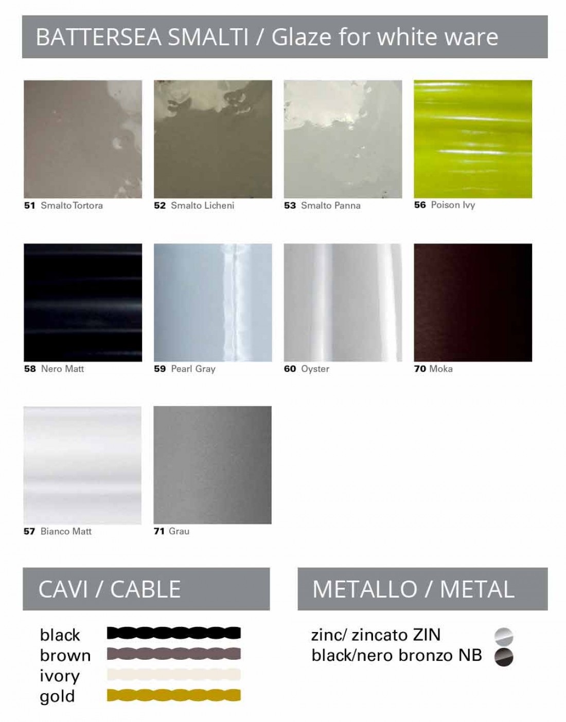 Battersea to elegancki i wyrafinowany reflektor sufitowy, wykonany ręcznie z ceramiki zgodnie z prawdziwą toskańską tradycją. Oryginalny design tego reflektora i jego linie sprawiają, że jest on aktualny i nowoczesny, odpowiedni do różnych środowisk. Designerski reflektor, od retro po nowoczesny. Wykonany z wysokiej jakości materiałów, Battersea jest dostępny w różnych wykończeniach i gwarantuje bezpośrednią wiązkę światła. Oprócz możliwości wyboru zewnętrznego wykończenia ceramiki, istnieje zatem również możliwość wyboru wykończenia kabla elektrycznego. Wyraź swoją kreatywność, wybierając preferowane wykończenia!
