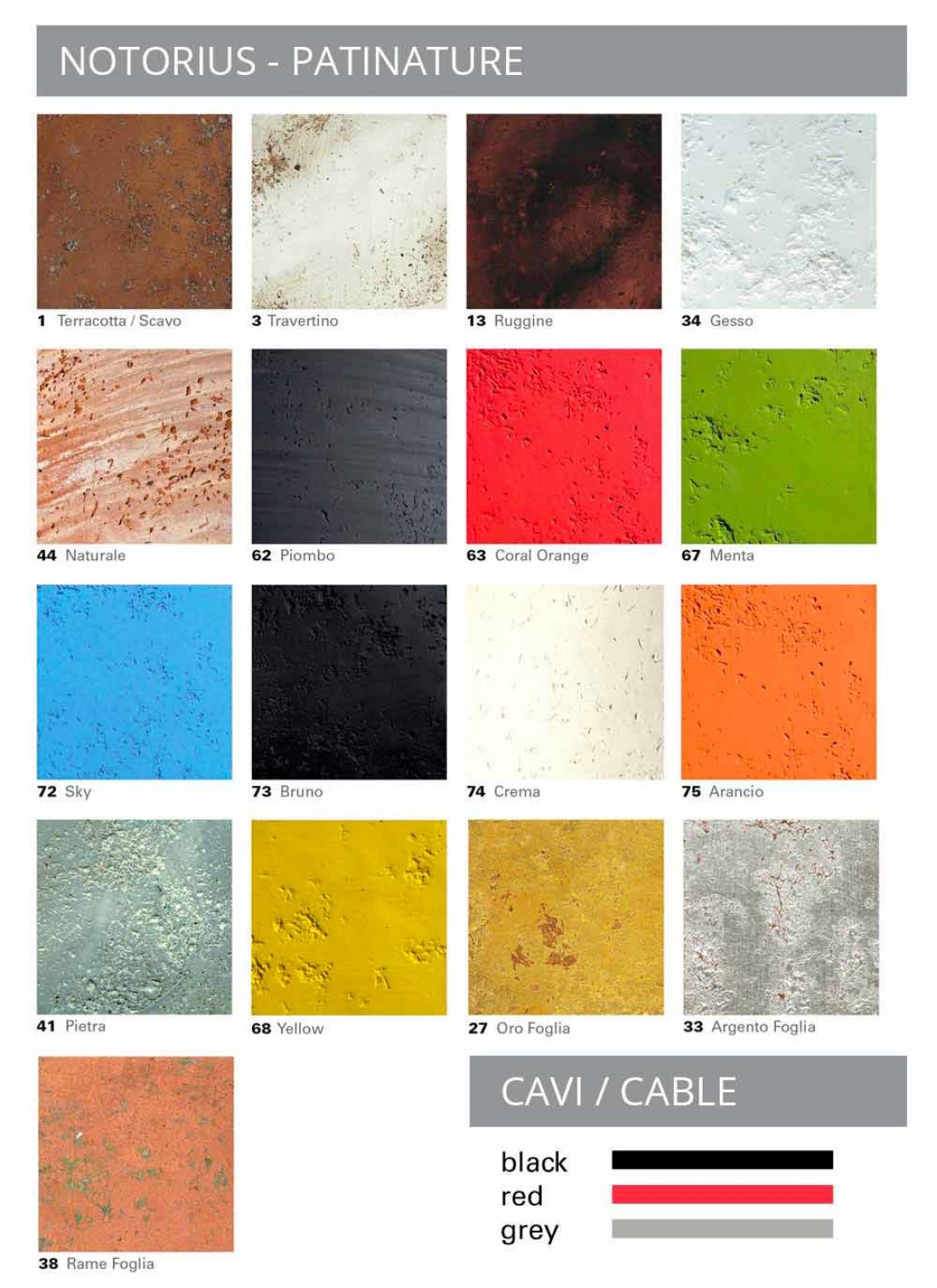 Uwaga: Lampa dostępna w różnych wariantach chromatycznych, zarówno do wykończenia zewnętrznego, wewnętrznego, jak i klosza przewodu elektrycznego. Zobacz tabelę kolorów i w odpowiednim polu wskaż żądane kody kolorów.