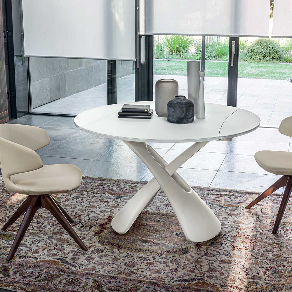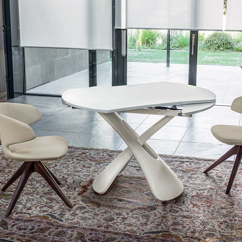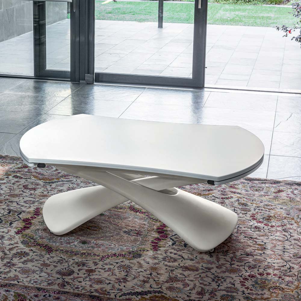 Stolik kawowy zamieniany w stół jadalny z metalową podstawą i szklanym blatem, wyprodukowany we Włoszech.