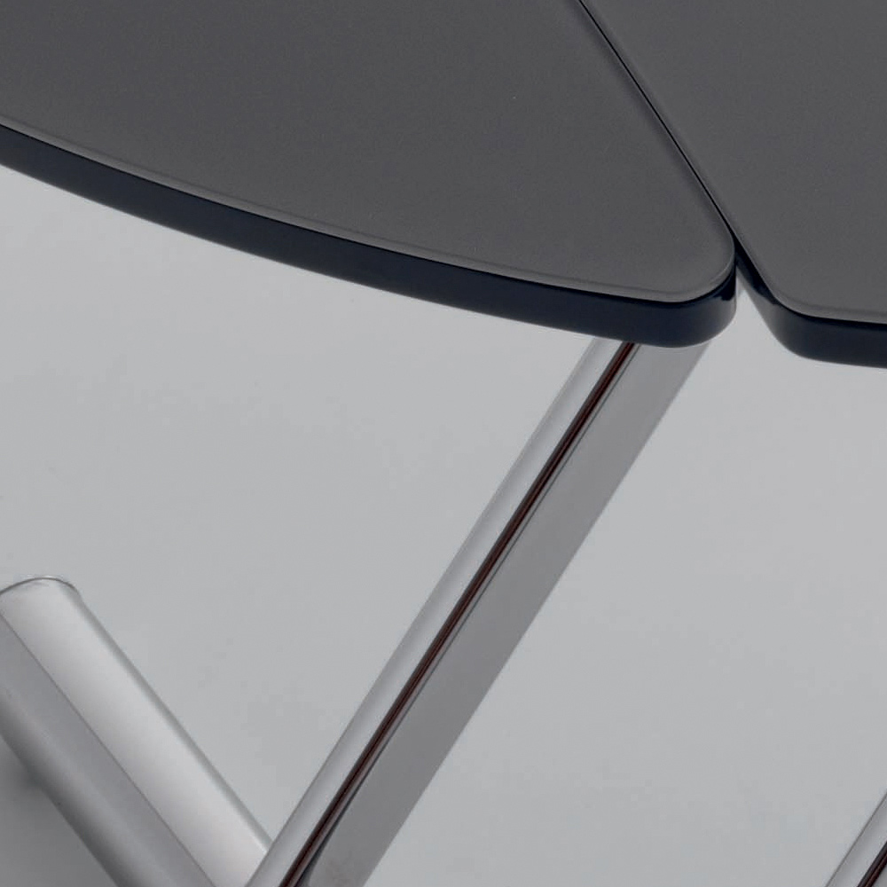 Składany stolik kawowy, metalowa podstawa i szklany blat, wykonane we włoskim stylu.