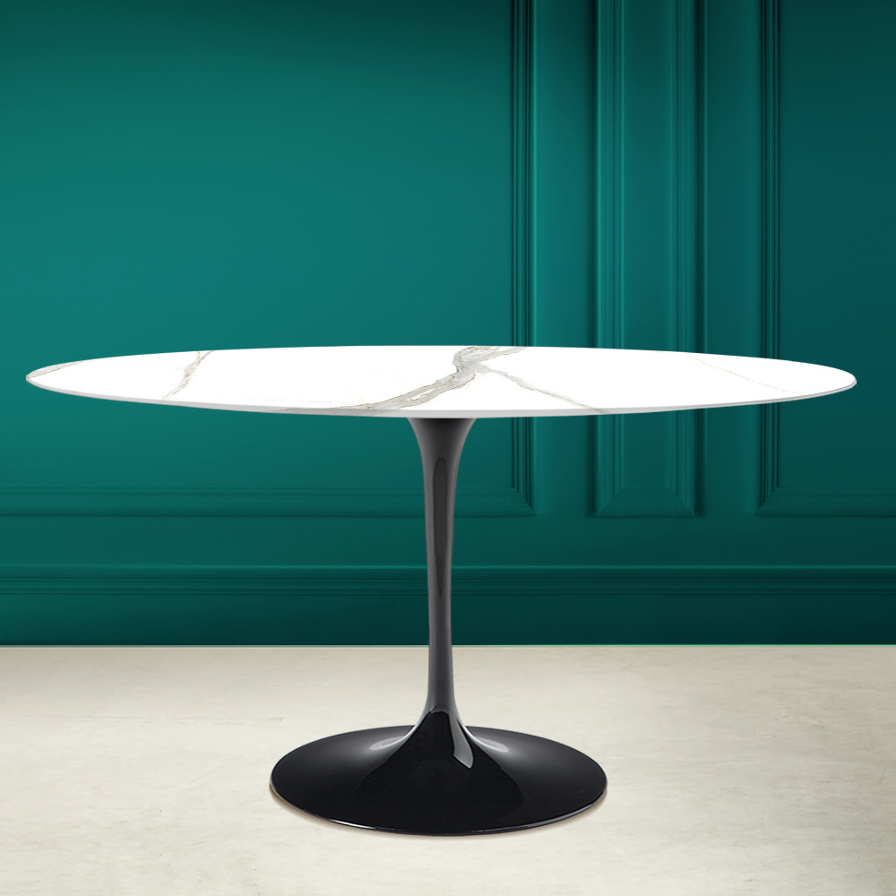 Made in Italy. Ten stół ma dwie cechy, które czynią go wyjątkowym w swoim rodzaju: owalny kształt i ceramikę calacatta michelangelo.