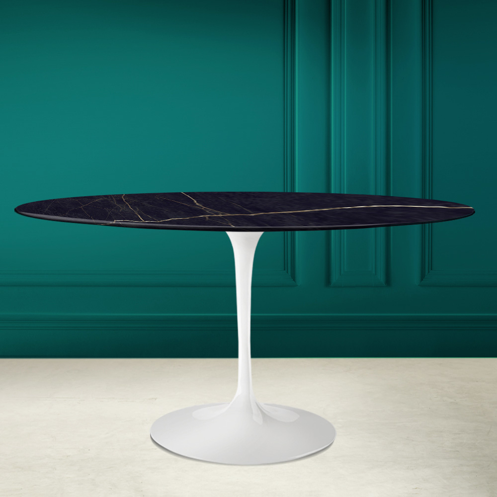 Owalny stół do jadalni z blatem z ceramiki noir laurent i podstawą z polerowanego aluminium Made in Italy