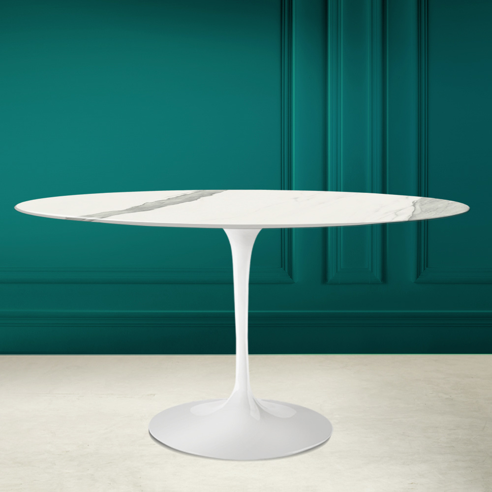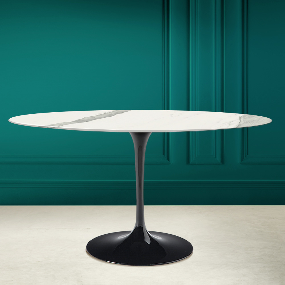 polerowaną aluminiową podstawą. Stół ten jest idealnym elementem nadającym oryginalny charakter każdemu salonowi i kuchni dzięki owalnemu kształtowi i ceramice statuario fulvein.