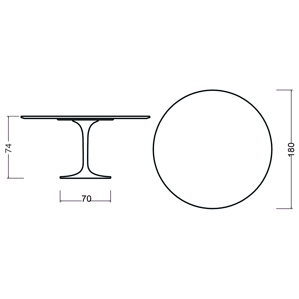 - Średnica blatu 180 x wysokość 74 cm / średnica podstawy 70 cm