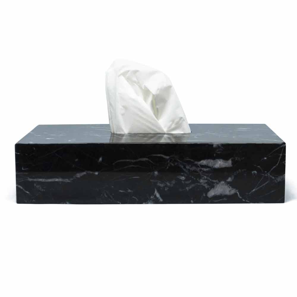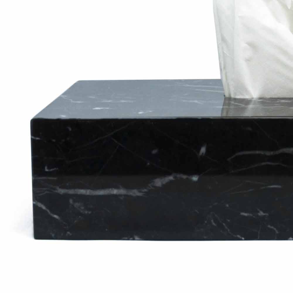Praktyczny pojemnik na chusteczki dostępny w wersji prostokątnej w całości wykonany z czarnego marmuru Marquinia wykonany ręcznie przez wyspecjalizowanych profesjonalistów. Jest to dzieło wyjątkowe, ponieważ każdy użyty blok marmuru różni się od pozostałych żyłkami i odcieniami.