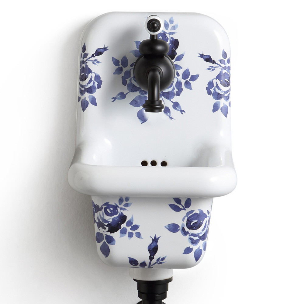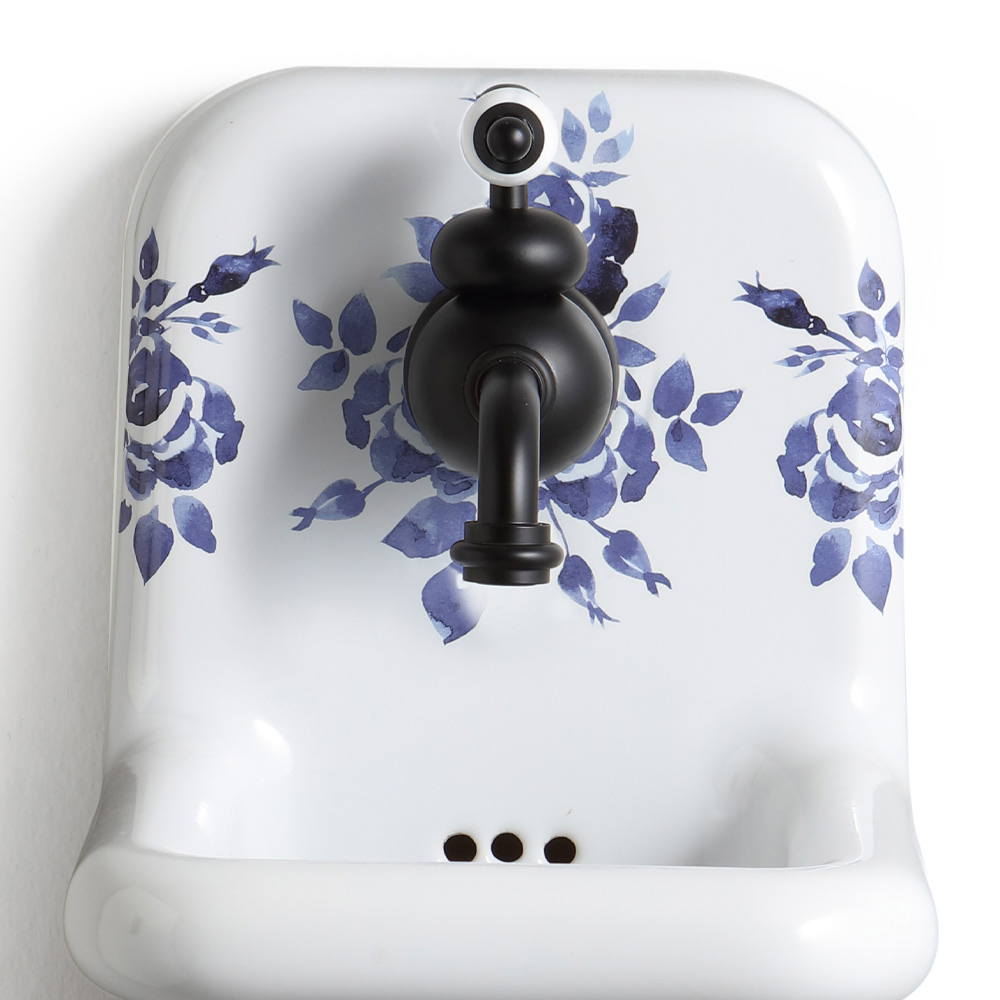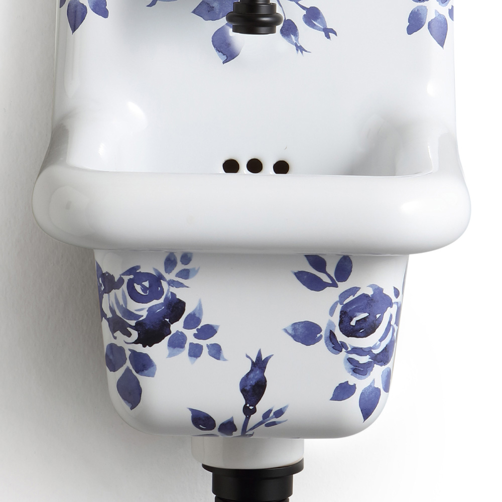 Umywalka wisząca ze wzorzystej kolorowej ceramiki w stylu vintage.
