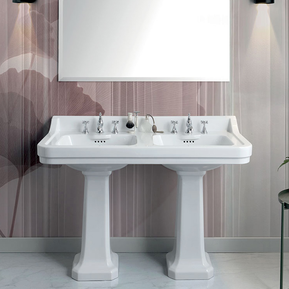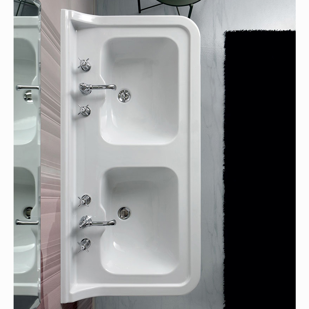 Umywalka konsolowa z podwójną umywalką wykonana z błyszczącej białej ceramiki poprzez produkcję rzemieślniczą w 100% Made in Italy . Mebel, który ożywia klasyczne projekty z minionych lat, aby nadać charakteru równie klasycznym przestrzeniom łazienkowym, ale także nowoczesnemu otoczeniu, w którym można bawić się oryginalnymi i niespotykanymi dotąd kontrastami stylistycznymi .