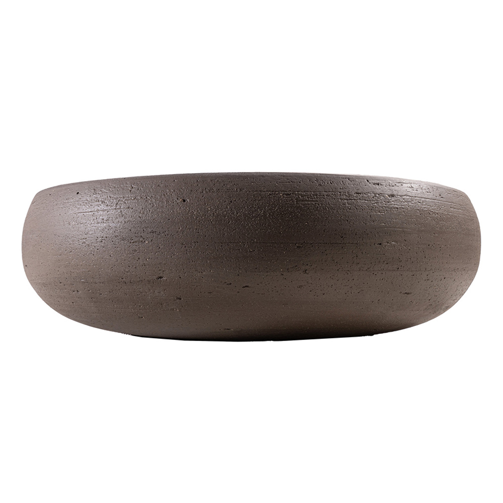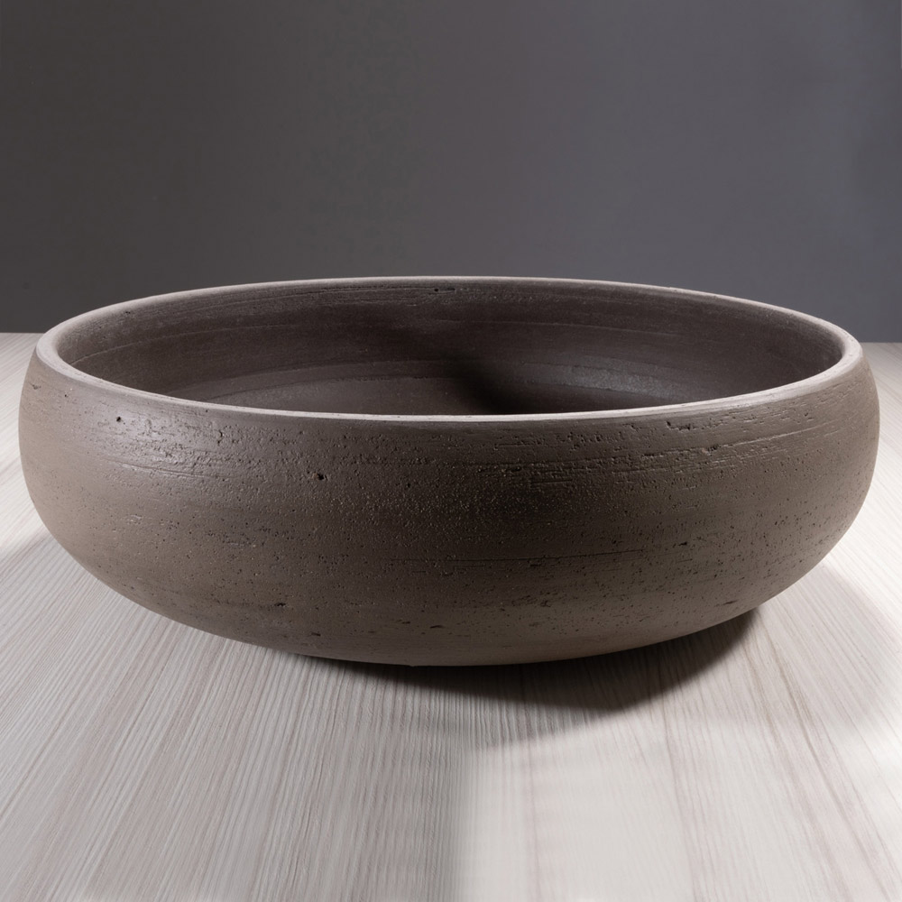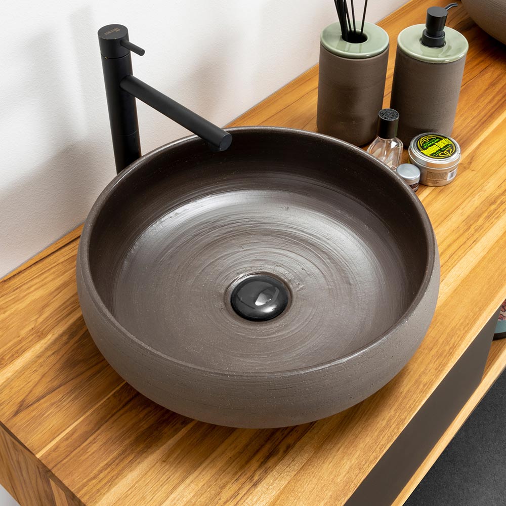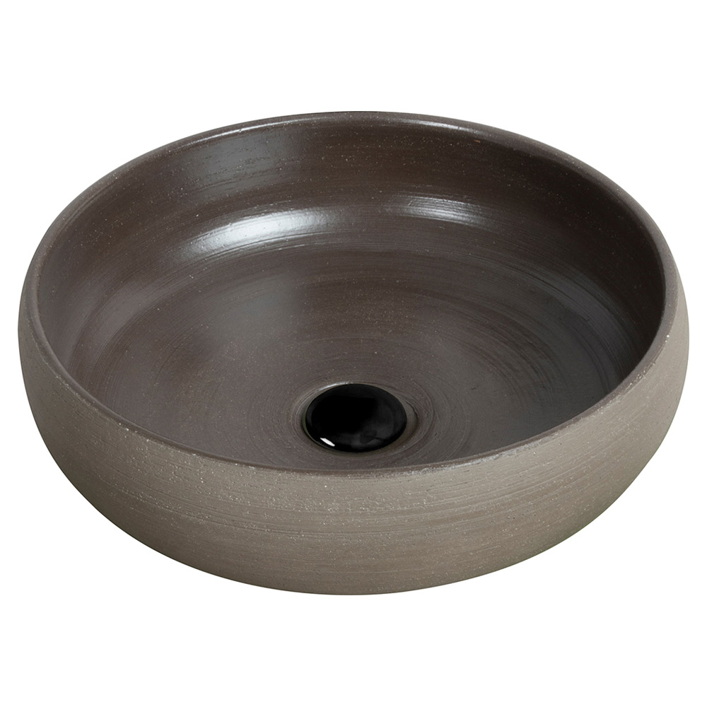 Umywalka nablatowa o okrągłym kształcie z gliny ogniotrwałej i ciemnej ziemi w całości wykonana we Włoszech, obrócona ręcznie i wypalona w trzecim ogniu. Wciągający mebel w dotyku, wijący się w miękkich kształtach i dużych wymiarach, które łączą styl i funkcjonalność , dzięki czemu idealnie nadaje się do umieszczenia w każdej łazience. Rustykalne i eleganckie wykończenie podkreśla świetlisty charakter tego zlewozmywaka, czyniąc go bohaterem i rozświetlając atmosferę.
