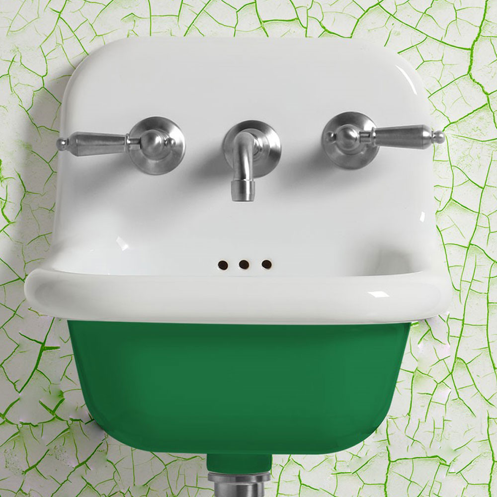Umywalka łazienkowa wisząca w stylu vintage z ceramiki w kolorze białym i kolorowym.
