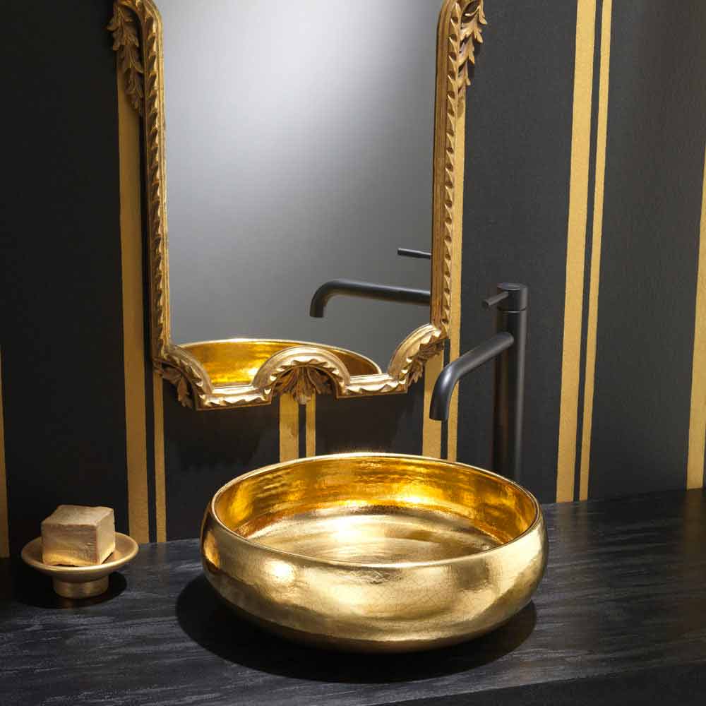 Projekt zlewozmywaka wbudowanego w ceramikę ze złotego raku z Włoch, Ramon Umywalka nablatowa ręcznie wykonana i odwrócona we Włoszech w 24-karatowym złotym wykończeniu z raku.