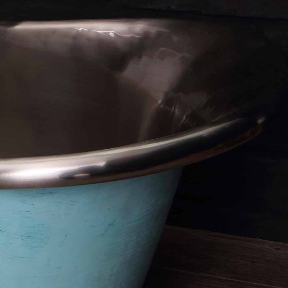 Umywalka łazienkowa nablatowa w całości wykonana z miedzi, z wewnętrznym wykończeniem w kolorze satynowego niklu i zewnętrznym wykończeniem w kolorze zielonym, w całości wykonana ręcznie. Umywalka w stylu vintage, która łączy w sobie piękno i elegancję, nada Twojemu domowi odrobinę klasy!