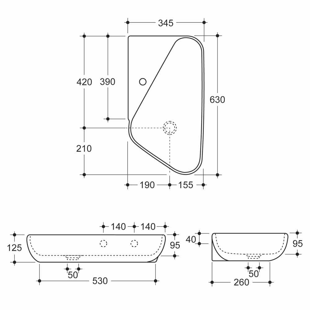 Designerska umywalka z trójkątną umywalką, wyposażona w półkę na baterię i mydło.