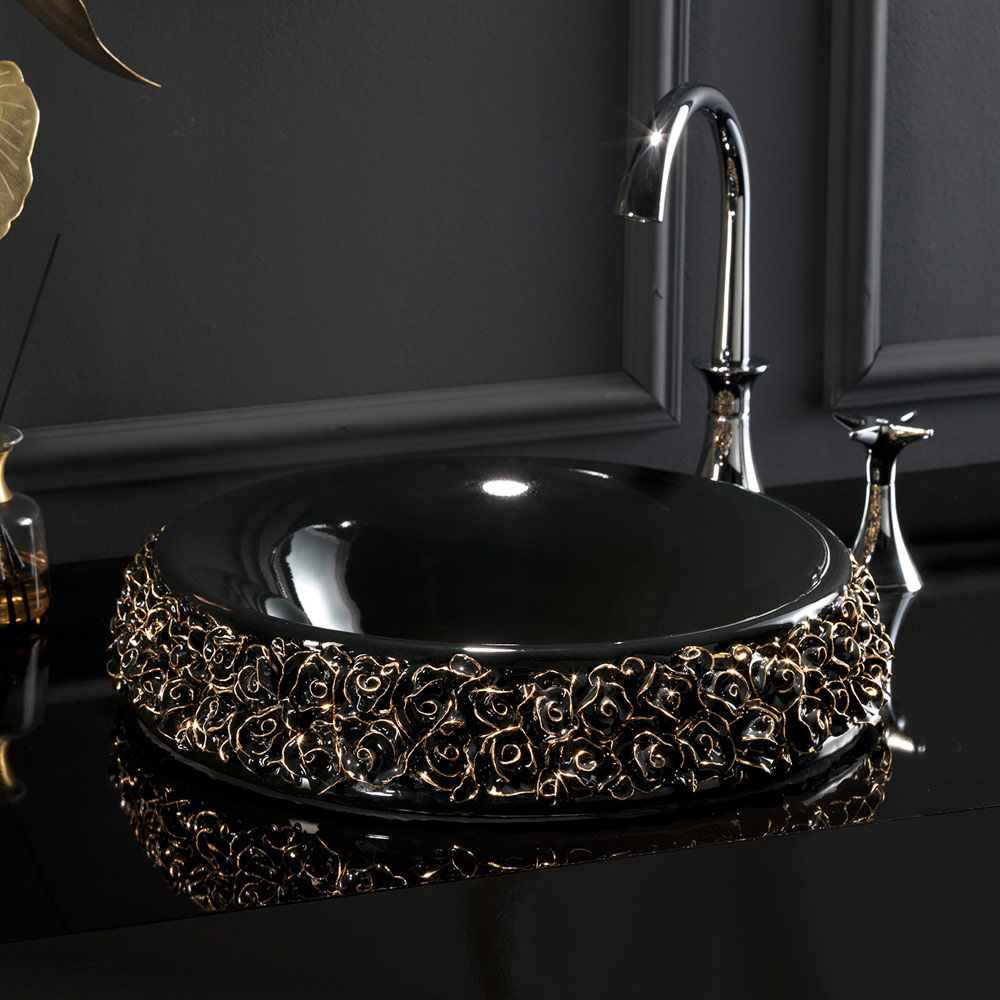 - błyszcząca czarna umywalka ze złotymi płatkami