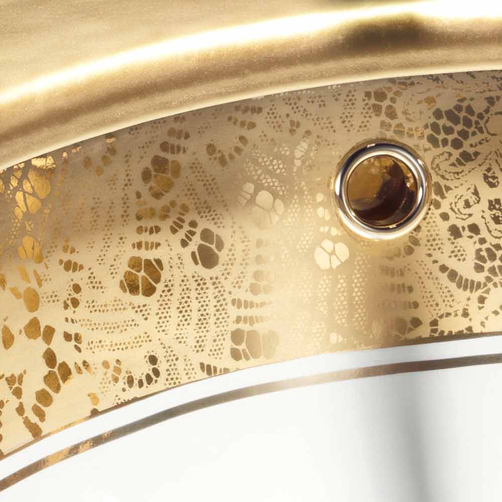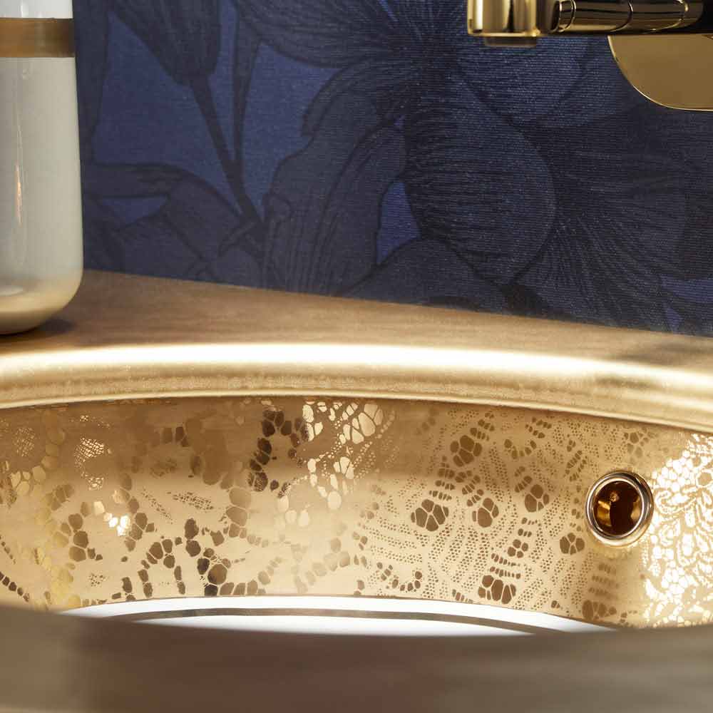 Wbudowany zlew łazienkowy wykonany we Włoszech w glinie ogniowej ręcznie we Włoszech z ozdobnym paskiem i odpływem z 24-karatowego złota.