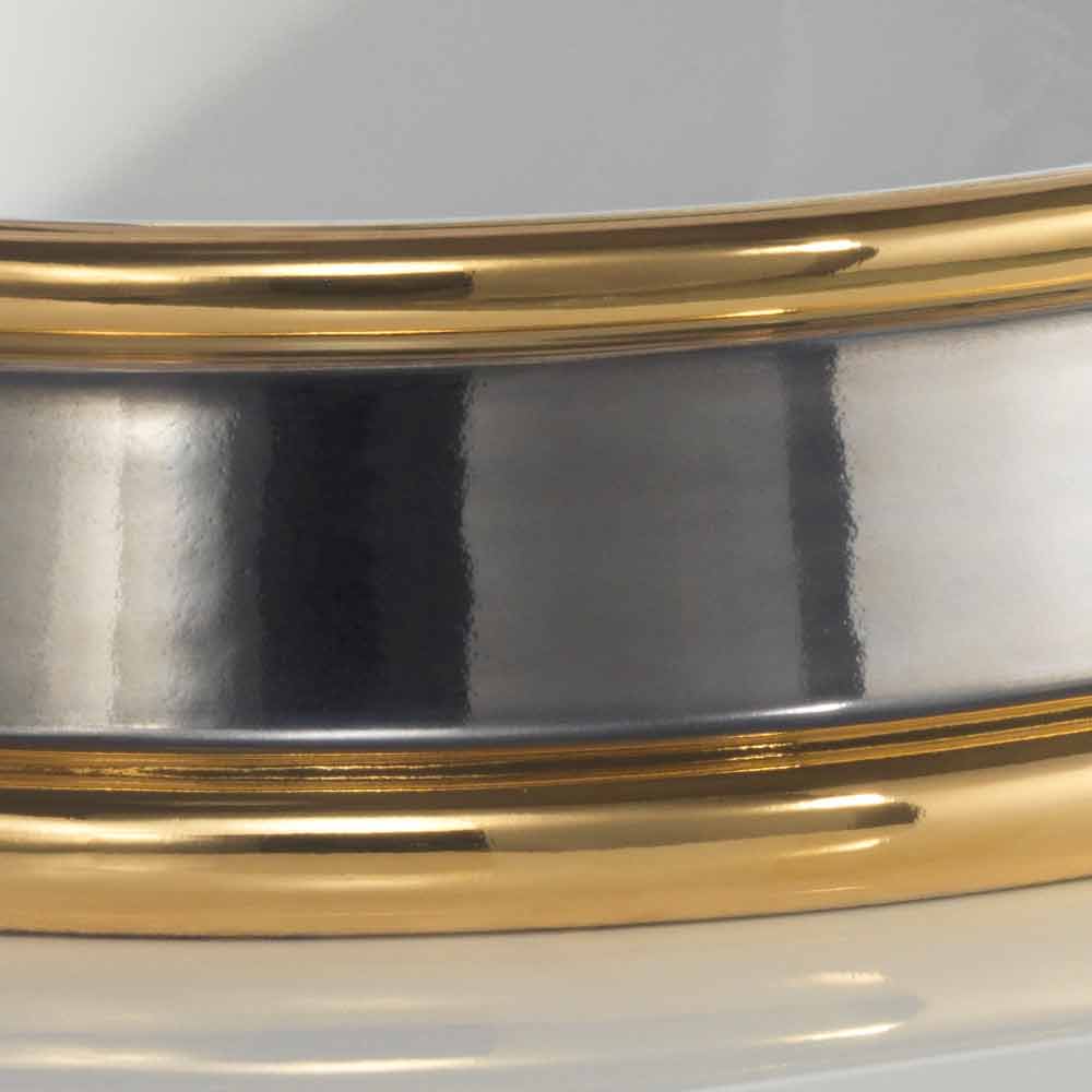 Zlew zlewozmywakowy wykonany z włoskiej gliny ognistej, ręcznie wykonany, z paskiem ręcznie malowanym platyną i pierścieniami ręcznie malowanymi 24-karatowym złotym wykończeniem.