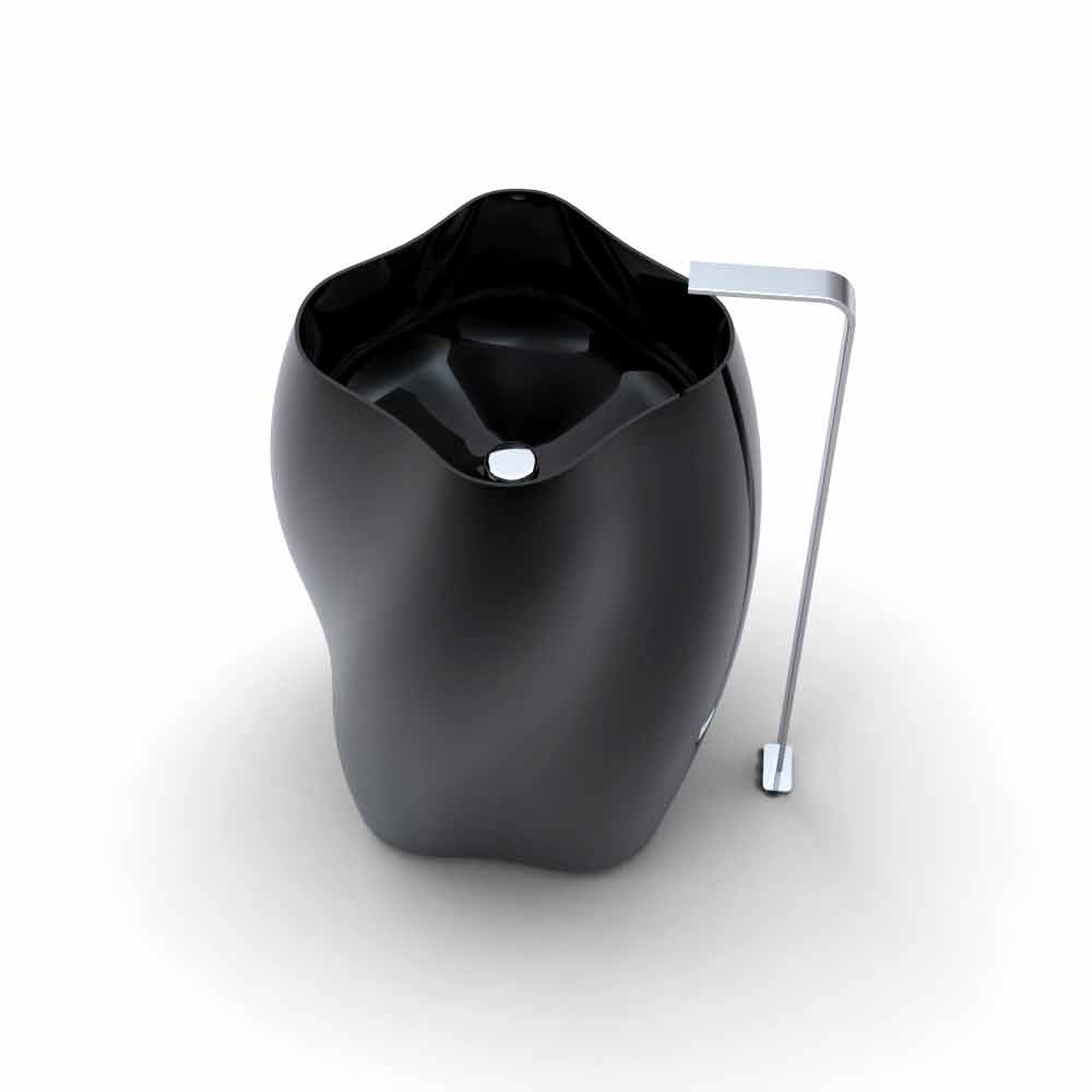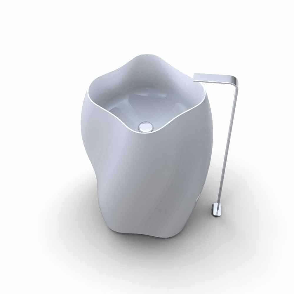 Umywalka wolnostojąca o falistych i organicznych kształtach, w Solid Surface; Jej linie pokazują profil, który przypomina sylwetkę „egzotycznego” kwiatu. Oprócz „falistego” profilu bocznego, ma on sam w sobie lekko „skręcony” kształt, smukły ku górze, ukazujący pojedynczą czworokątną umywalkę z płatami. Ta ostatnia prezentuje się jako kolejny element charakteryzacji i podstawowa figura geometryczna, generująca całą kompozycję. Również ceramika sanitarna charakteryzuje się dobrą ergonomią, ponieważ jest dość zaokrąglona, dostępna w dwóch różnych wariantach kolorystycznych: białym (RAL9003) lub czarnym (RAL9005).