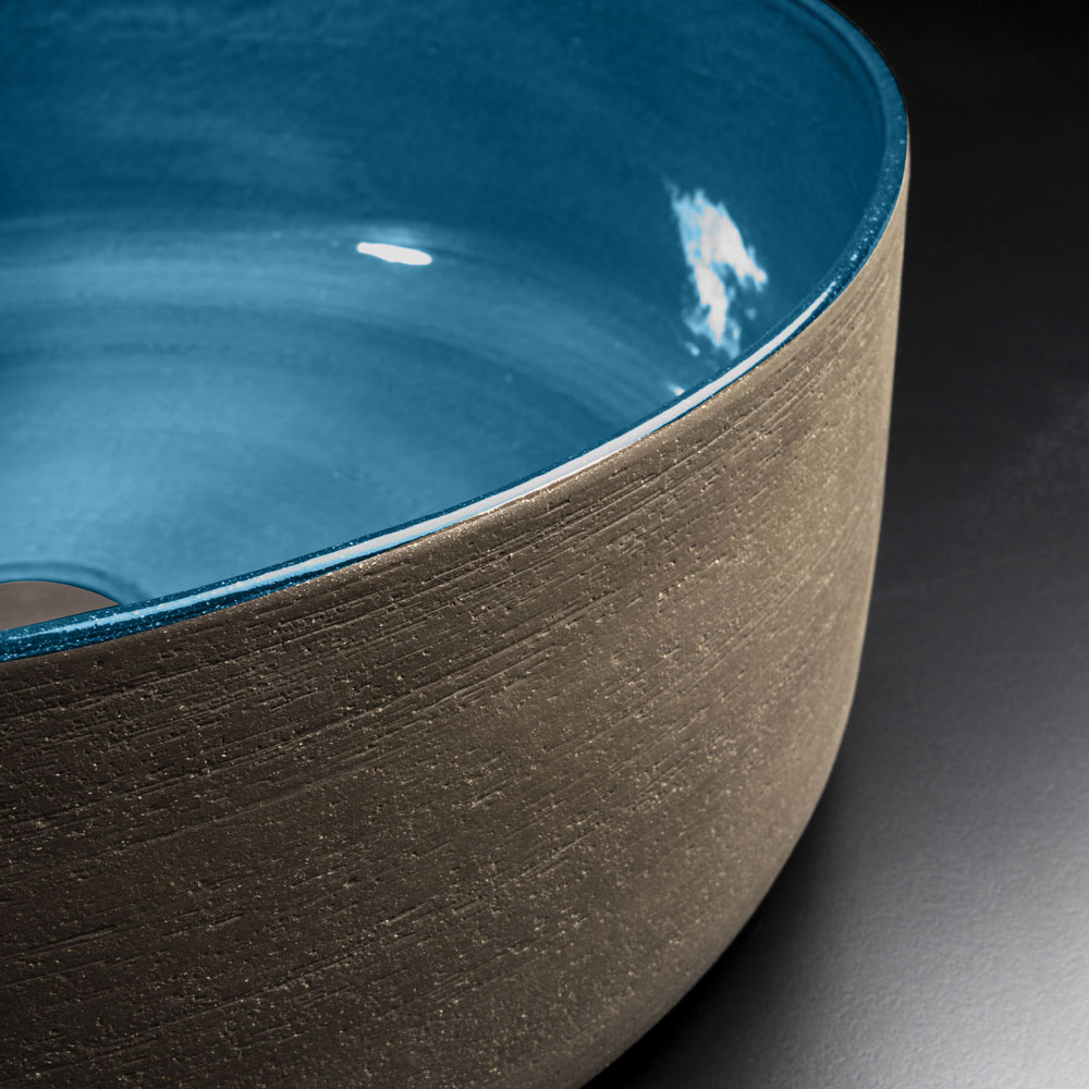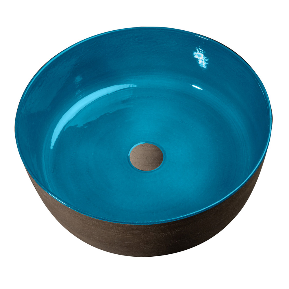 Okrągła umywalka nablatowa w całości wykonana we Włoszech z gliny ogniotrwałej , obracana ręcznie przy gotowaniu na trzecim ogniu. Jego estetyka charakteryzuje się doskonałym połączeniem naturalnej woskowanej i wodoodpornej powierzchni zewnętrznej z bardziej rustykalnym stylem oraz błyszczącym i zeszklonym niebieskim wykończeniem wnętrza o bardziej eleganckim i wyrafinowanym smaku. Każdy element umywalki jest wykonywany ręcznie , aby ożywić ekskluzywne rozwiązanie wyposażenia, o wysokiej wartości i niezrównanej jakości.