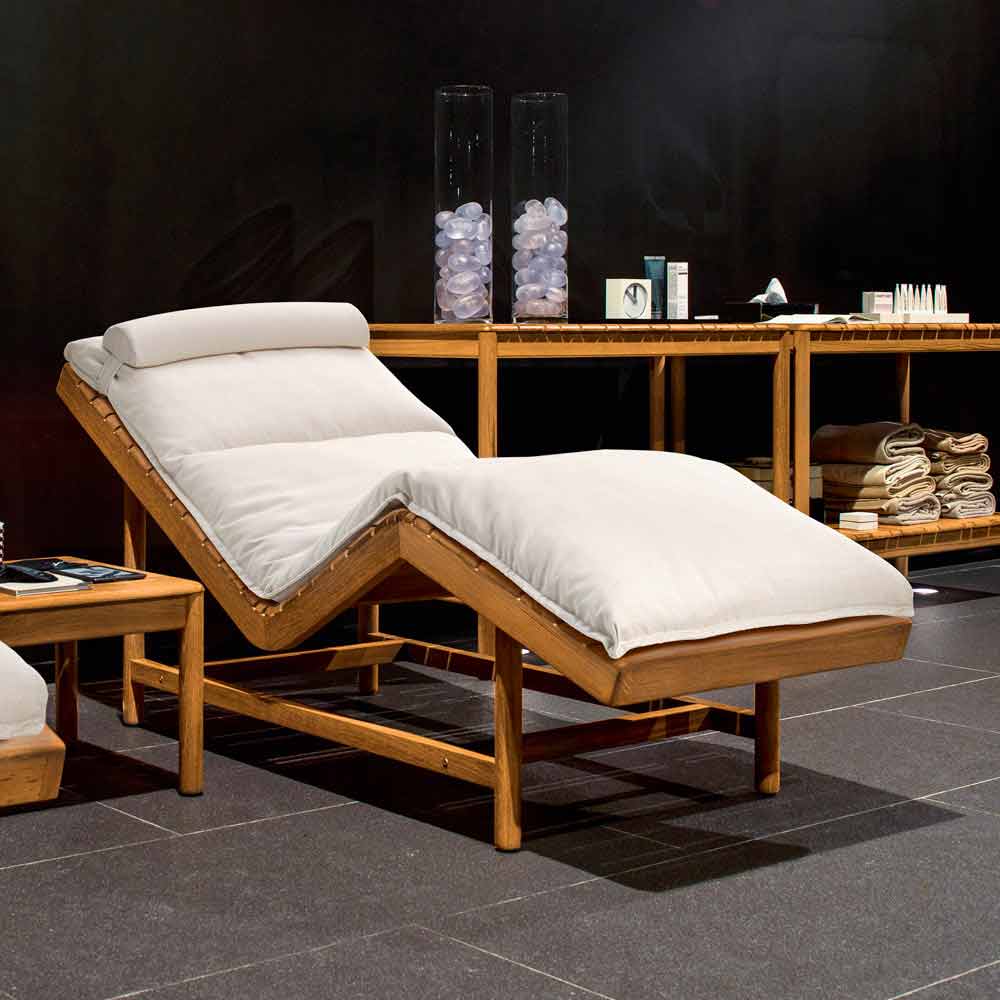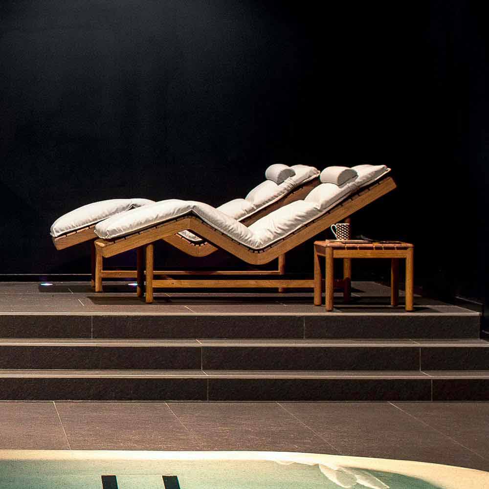 Leżak Barcode może być używany zarówno wewnątrz, jak i na zewnątrz i składa się z drewna tekowego z poduszką o wymiarach 197x70xH8 cm i poduszką zagłówkową 60x14xH7 cm (całkowicie zdejmowaną).