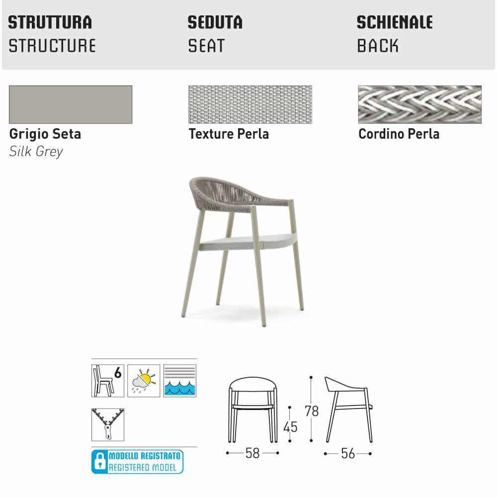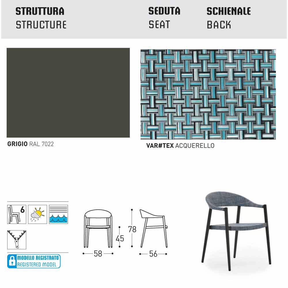 VAR # TEX: jest to tkanina z włókna PVC, 4x4. stworzony i zaprojektowany przez Varaschin dla produktów outdoorowych. Jest to włókno poliestrowe zabezpieczone powłoką PCV. Włókna są następnie łączone ze sobą w taki sposób, aby uzyskać szczególnie stałą i trwałą włóknistą substancję, odporną na rozciąganie, odporną na rozdarcie. Ta obróbka powierzchni zapewnia również wyjątkową odporność na zabrudzenia.