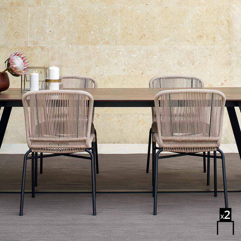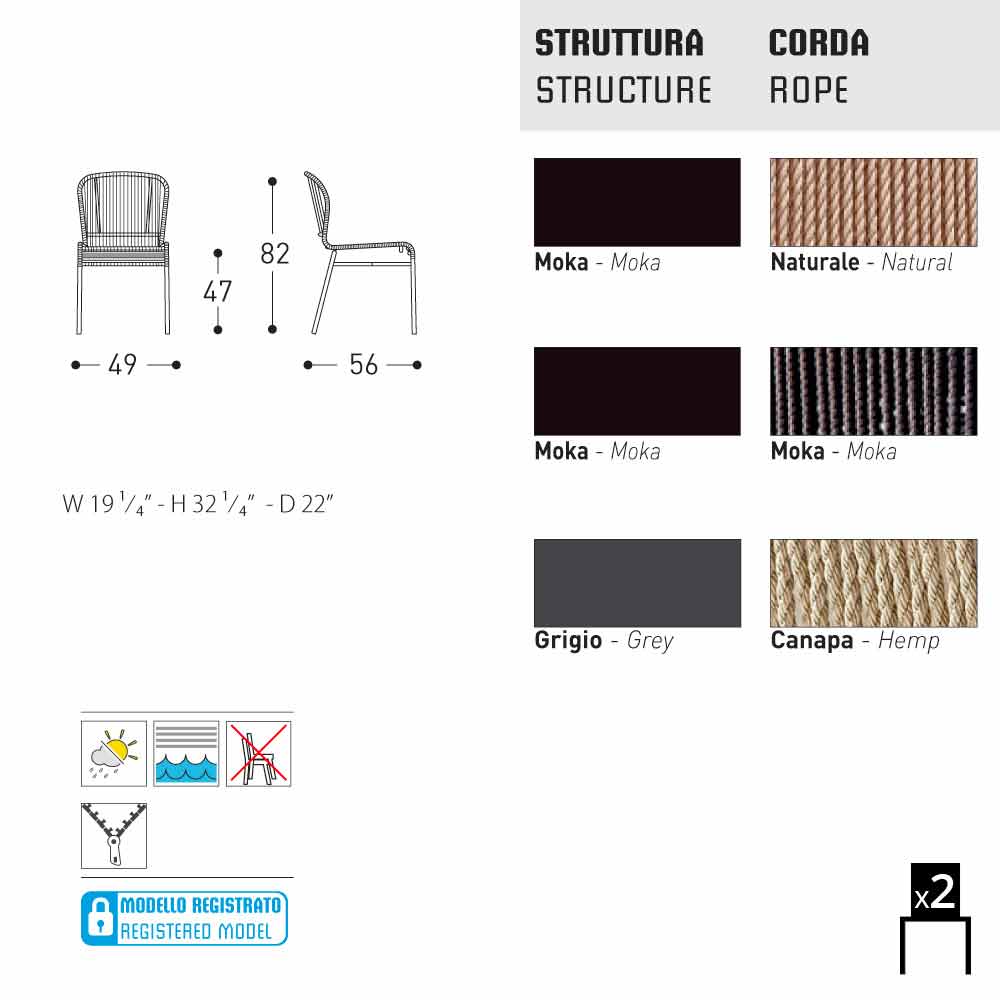 Zestaw składa się z 2 ręcznie plecionych siedzeń z włókna syntetycznego z malowaną ramą aluminiową. Może być używany zarówno jako krzesło ogrodowe, jak i do zony living.