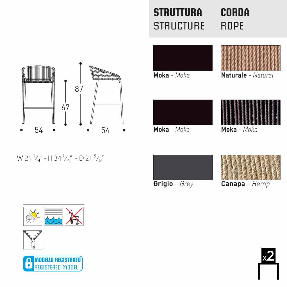 Zestaw składa się z 2 ręcznie plecionych siedzeń z włókna syntetycznego z malowaną ramą aluminiową. Może być używany zarówno jako krzesło ogrodowe, jak i do zony living.