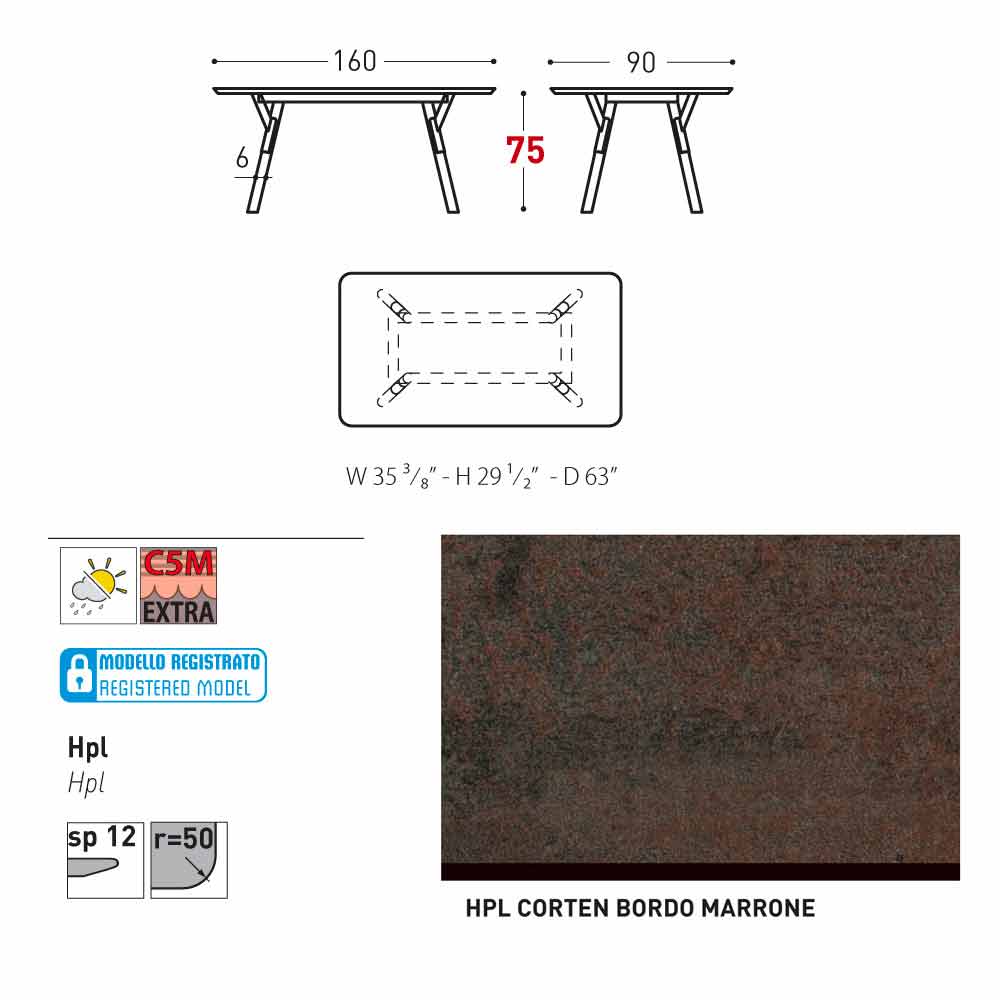 Struktura z lakierowanej stali nierdzewnej inox (wspornik + nogi). Blat dostępny w laminacie PHL o grubości 12mm lub z drewna teakowego o grubości 30 mm.