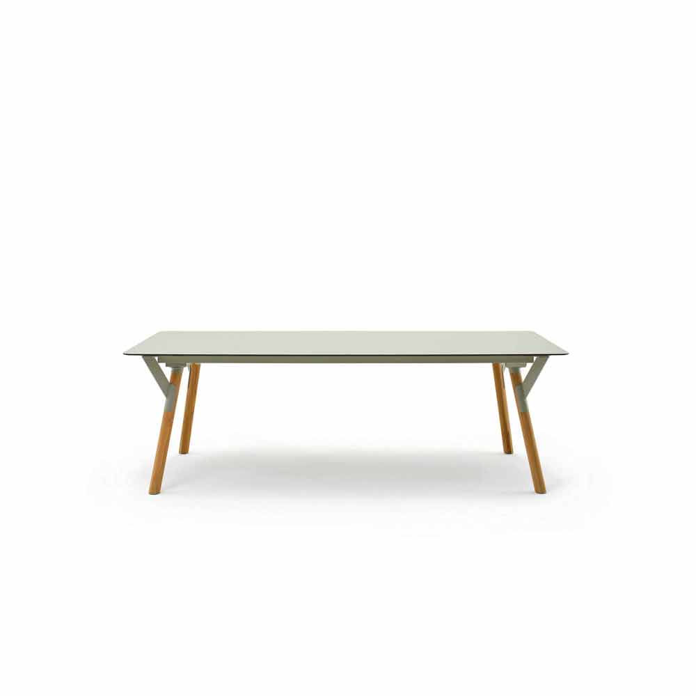 Stół z nowoczesną strukturą z lakierowanej stali nierdzewnej i nogami drewnianymi. Blat z HPL *grubość 12 mm lub z drewna tekowego *grubość 30 mm.