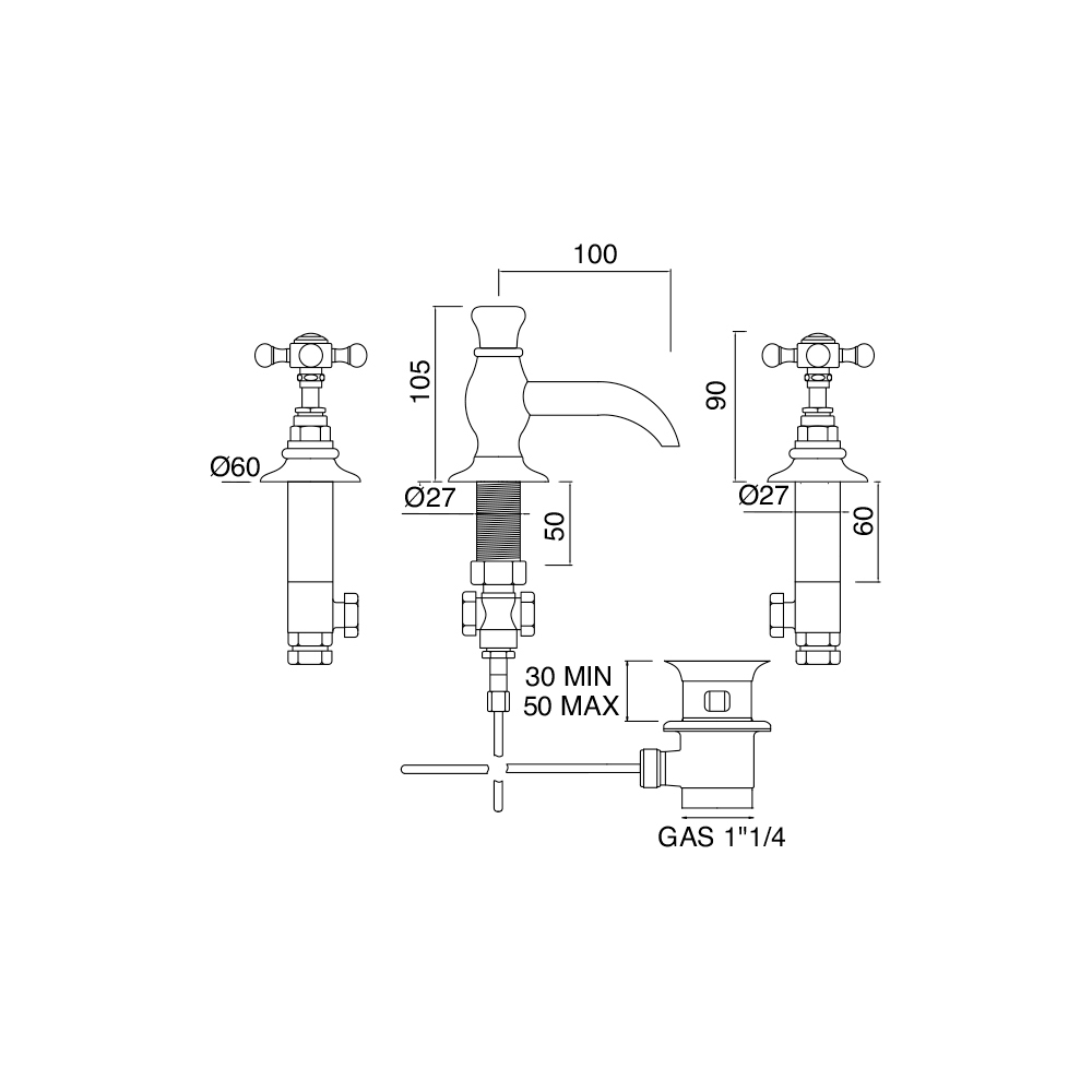 3-otworowa bateria umywalkowa z odpływem, wykonana z mosiądzu.