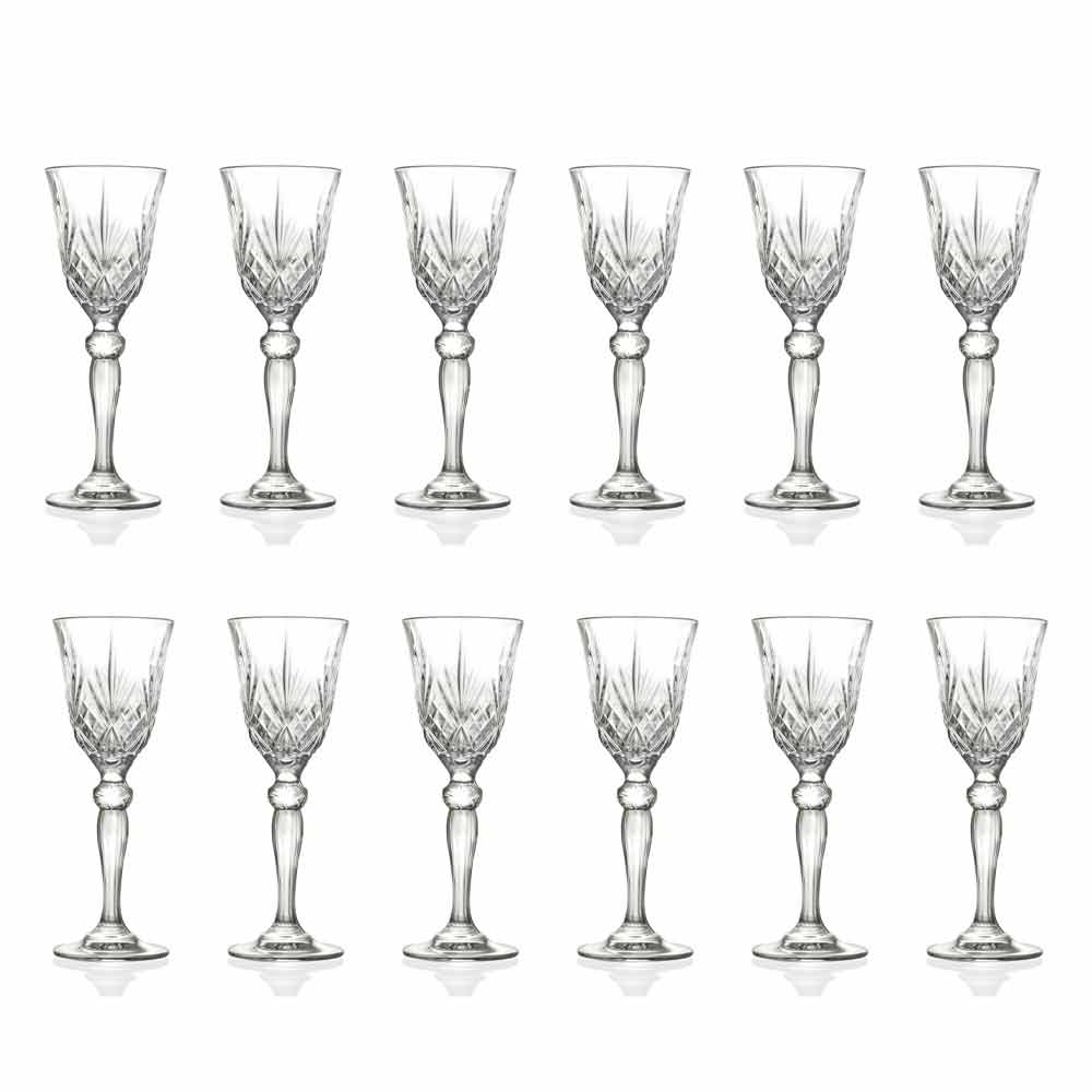 12 kieliszków do likieru w stylu vintage z ekologicznego kryształu wysokiej jakości w 100% wyprodukowanego we Włoszech.