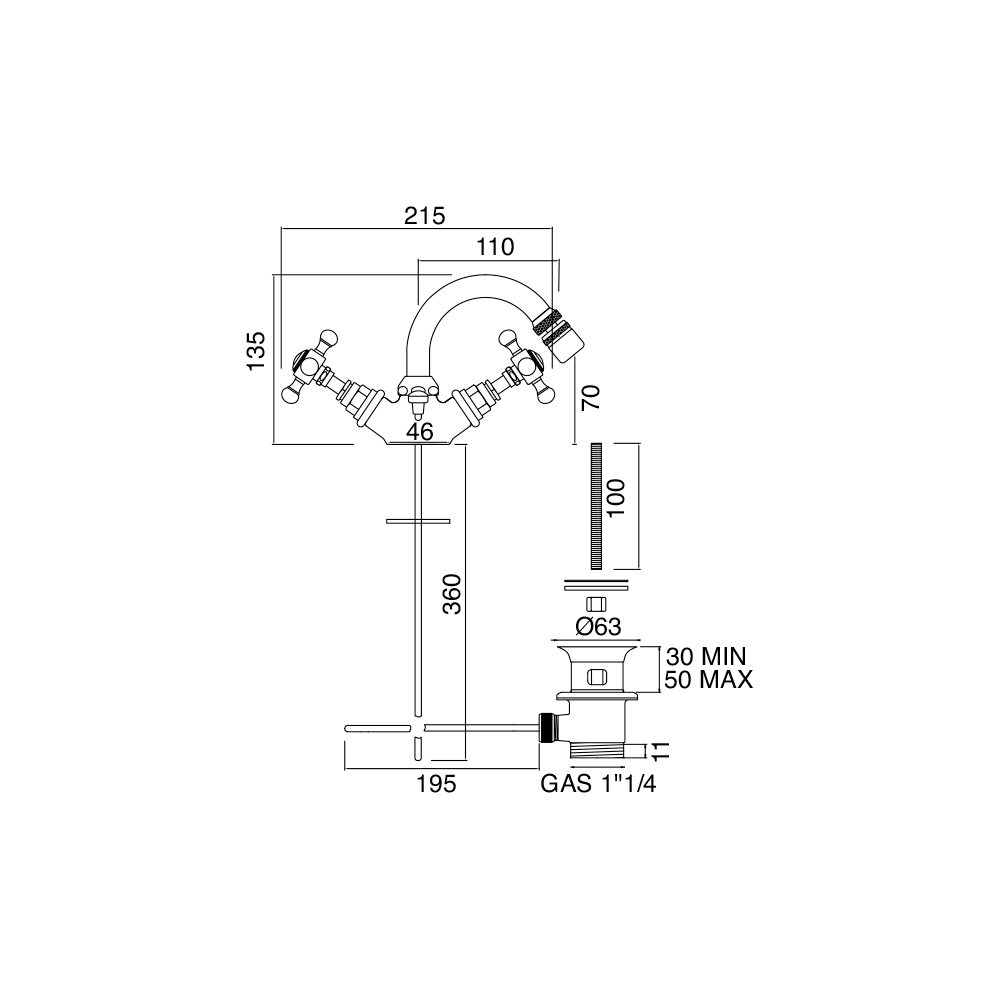 jednootworowa bateria bidetowa z odpływem, wykonana z mosiądzu.