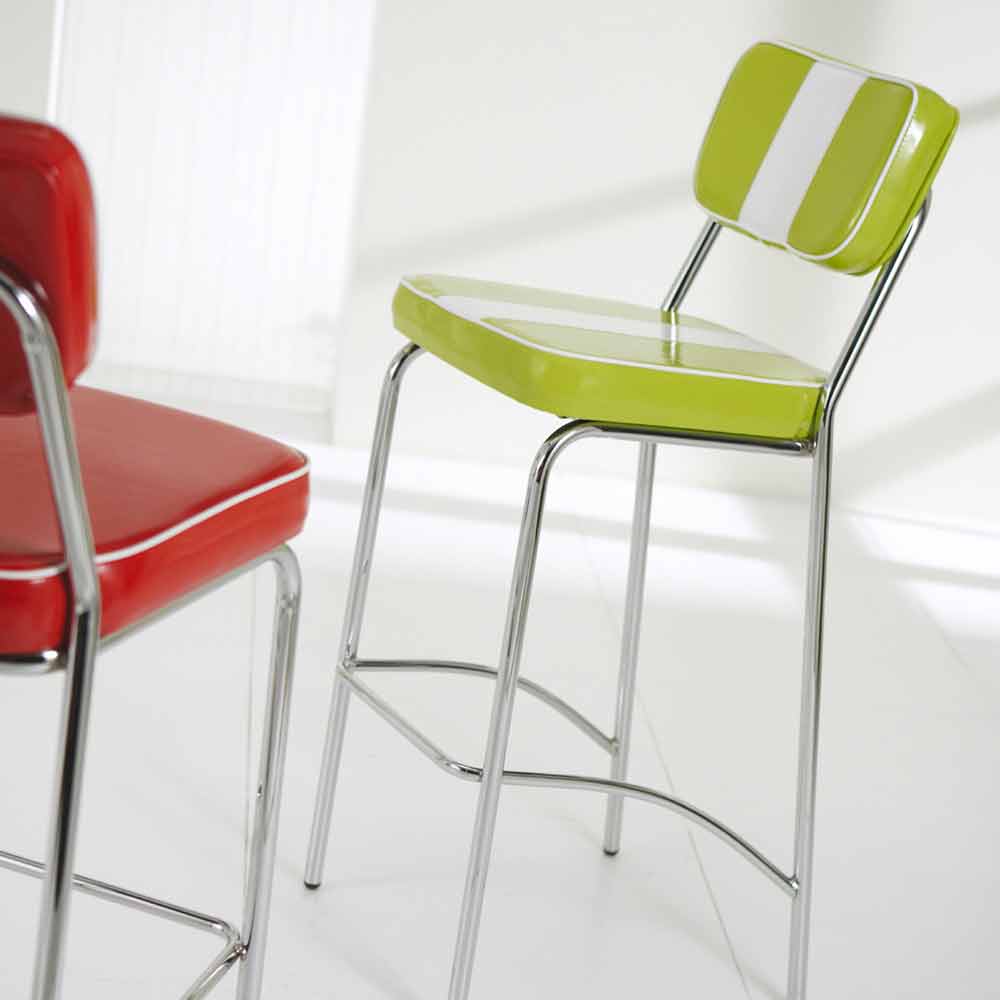 Taboret w stylu lat 50. z tapicerką ze sztucznej skóry graffiti i chromowaną strukturą.