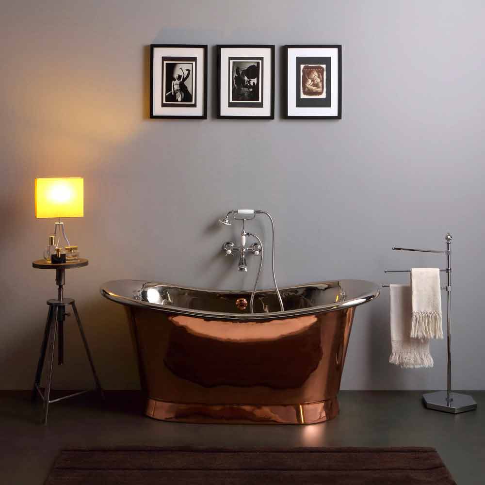 Ręcznie wykonana wanna o konstrukcji całkowicie miedzianej, z wewnętrznym wykończeniem z polerowanego niklu i zewnętrznym wykończeniem z miedzi.