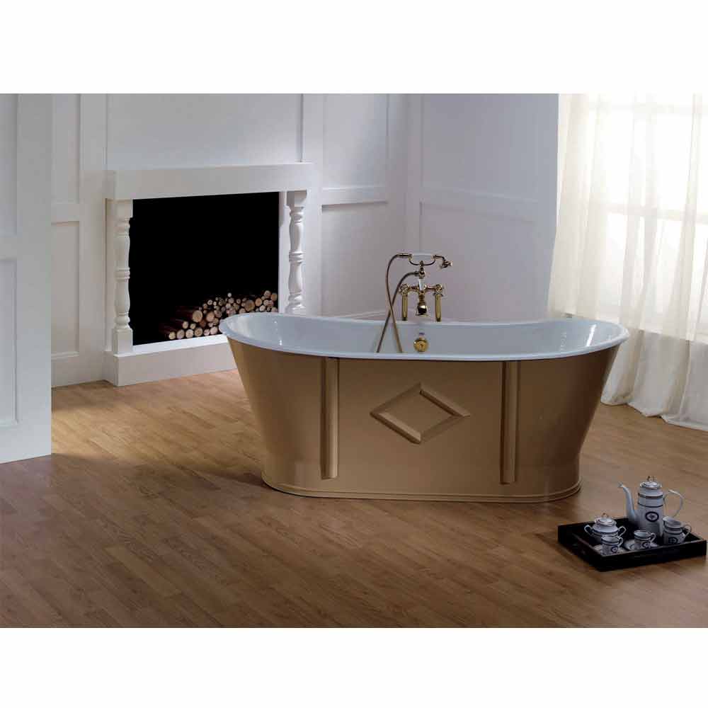 Wanna wolnostojąca w całości wykonana z żeliwa spoczywająca na ziemi, z dekoracją z boku. Wykończenie wewnętrzne 2 mm emalią tytanową i wykończenie zewnętrzne lakierowane w różnych kolorach. Wanna, która reprezentuje szczyt luksusu!