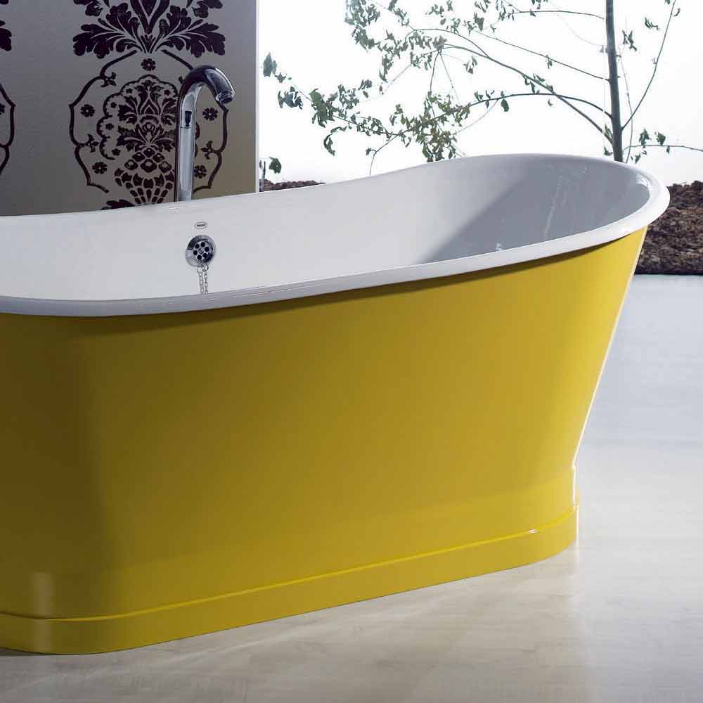 Wanna wolnostojąca w całości wykonana z żeliwa spoczywającego na ziemi. Wykończenie wewnętrzne 2 mm emalią tytanową i wykończenie zewnętrzne lakierowane w różnych kolorach. Wanna, która reprezentuje szczyt luksusu!