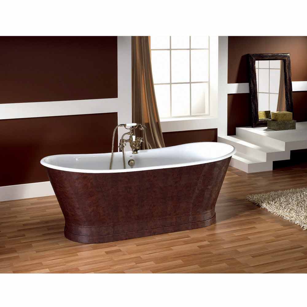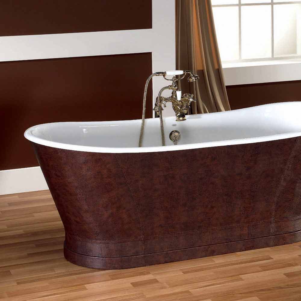 Wanna wolnostojąca w całości wykonana z żeliwa spoczywająca na ziemi. Wewnętrzne wykończenie emaliowane tytanem o grubości 2 mm, a na zewnątrz pokryte skórą. Wanna, która reprezentuje szczyt luksusu!